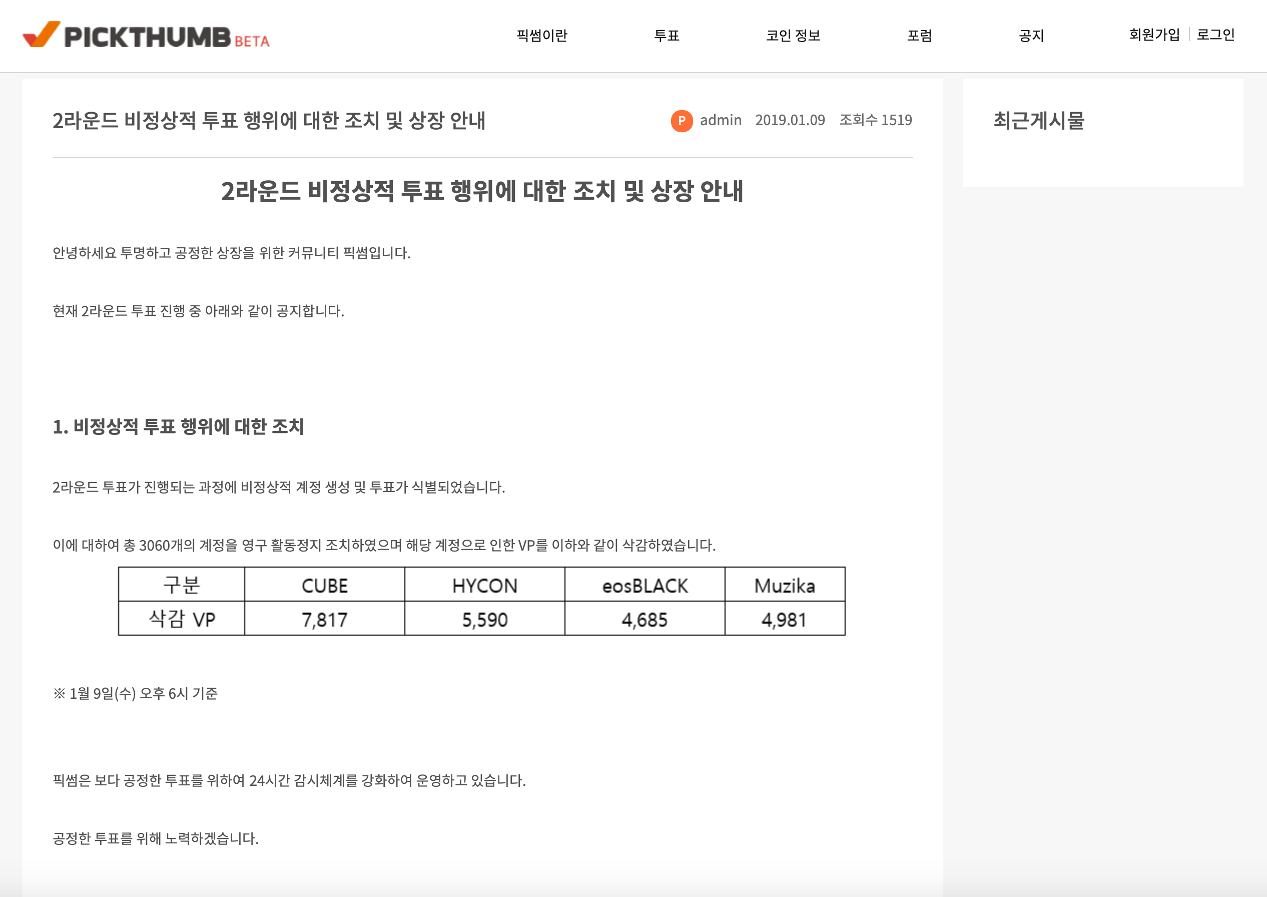 부정 투표, 즉 어뷰징에 대해 픽썸 측은 24시간 모니터링한다고 밝혔다. 가장 많은 어뷰징을 한 순으로 큐브(7817), 하이콘(5590), 뮤지카(4981), 이오스블랙(4685) 이다. 해당 프로젝트의 우수성을 기반으로 상장되는 것이 아닌, 마케팅과 어뷰징으로 상장된다는 뜻이다.