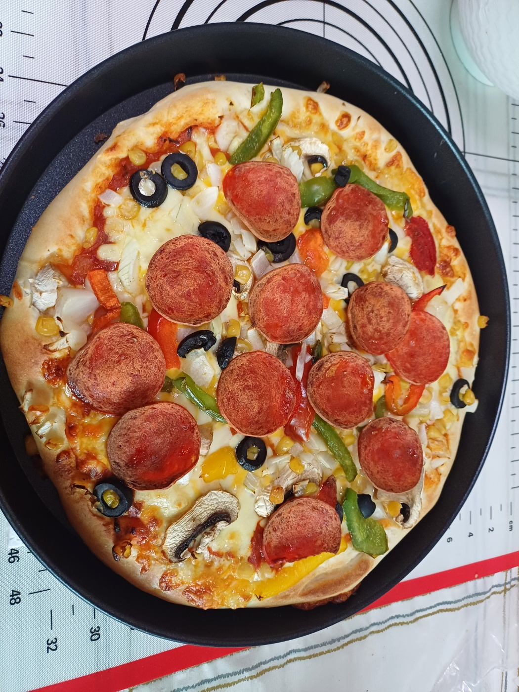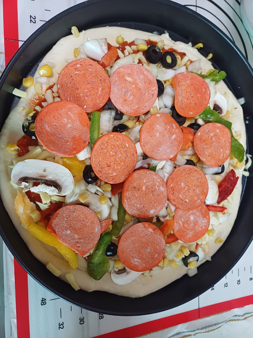 오븐이 오기 전부터 피자랑 피자빵을 만들기 위한 준비를 다 해뒀습니다. 냉동 도우, 밀대, 피자팬, 오븐온도계, 페페로니, 모짜렐라 치즈, 잭치즈, 피망, 슬라이스 올리브, 스위트콘, 콜라, 빵포장비닐 등등! 온라인 쿠팡, 트레이더스 오프라인 안가리고 댕겼네요.