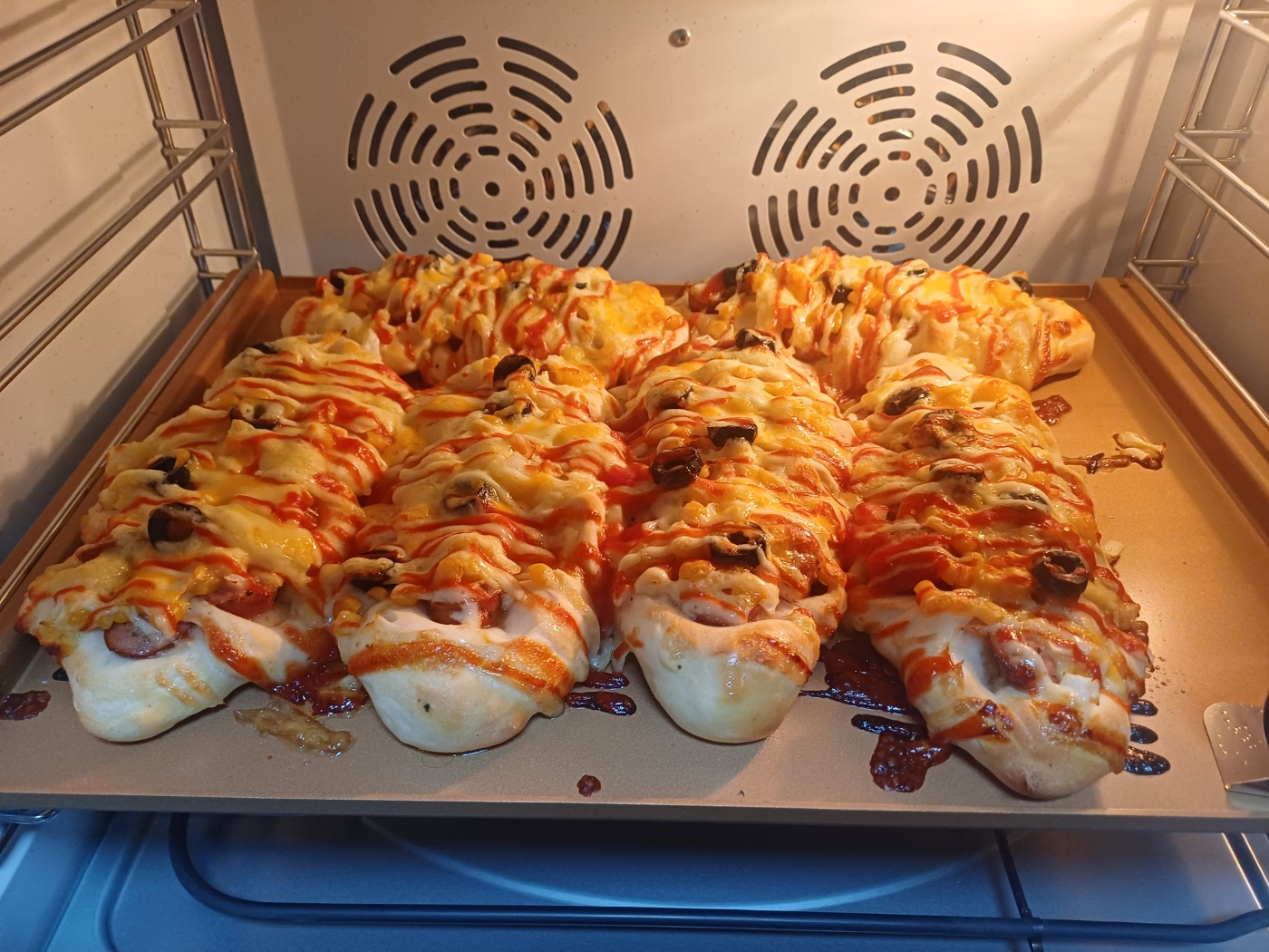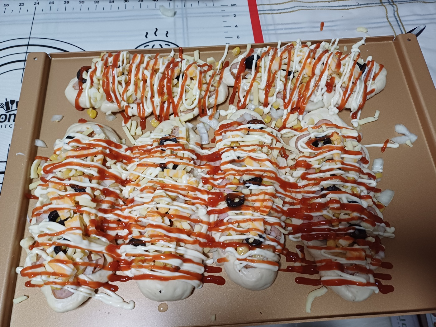 처음 딱 한판 만들 때는 즐겁다 재밌다였는데 4판 구우려니 힘드네요 ㅎㅎ... 자영업은 못할거 같아요 ㅎㅎ 열심히 회사 다녀야겠습니다. 한판에 6개씩 해서 4판 구워서 총 24개를 만들었습니다. 파는 피자빵들과 달리 치즈도 잔뜩 넣고 치즈 종류도 여럿에 소시지도 비싼 소시지 넣고 야채도 잔뜩 넣어서 그런지 먹을 때 피자빵이랑 느낌보다 피자 한조각 먹는 느낌이 있습니다ㅋㅋㅋ 이렇게 고생할 바에는 다음에는 네모틀을 사서 길쭉한 직사각형 피자빵처럼 만들어서 선물하는게 토핑도 더 많이 들어가고 저도 만들기도 편하고 좋을 거 같다는 생각이 드네요. 아직 선물 하지는 않아서 다들 어떤 반응을 할지는 모르겠지만 맛있게 먹어줬으면 좋겠습니다.