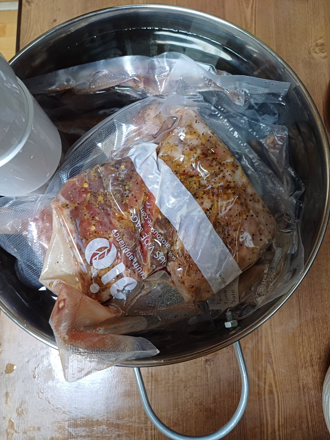 준비한 고기의 핏물과 잔뼈를 잘 닦아낸 뒤에 스테이크 시즈닝으로 밑간을 했습니다. 그 후 진공 포장 하여 수비드 머신에 넣었습니다. 조리시간은 65도로 12시간 가량 넣어두어서 손으로 충분히 찢을 수 있는 고기를 목표로 했습니다.