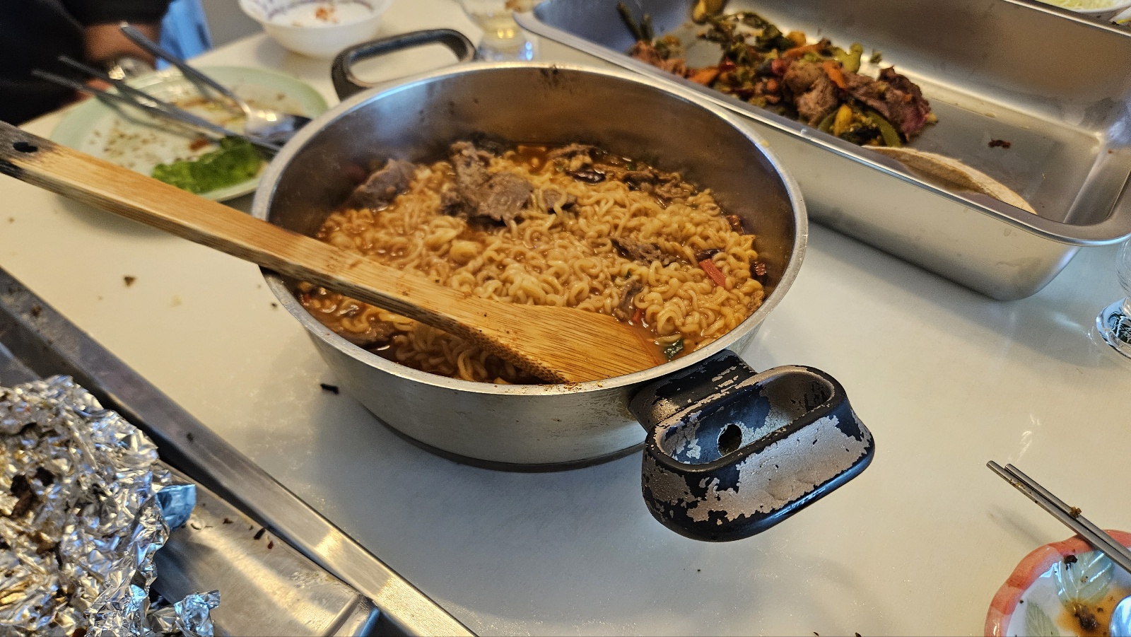 또띠아에도 싸먹고 야채랑 고기랑 시즈닝 뿌리고 볶은 것도 먹고 그러다 보니 국물 하나 더 먹을 때가 되어서 미리 뼈 주변 고기 썰은거 넣고 향식료 열심히 뿌려서 라면 하나 끓여서 먹었습니다.
