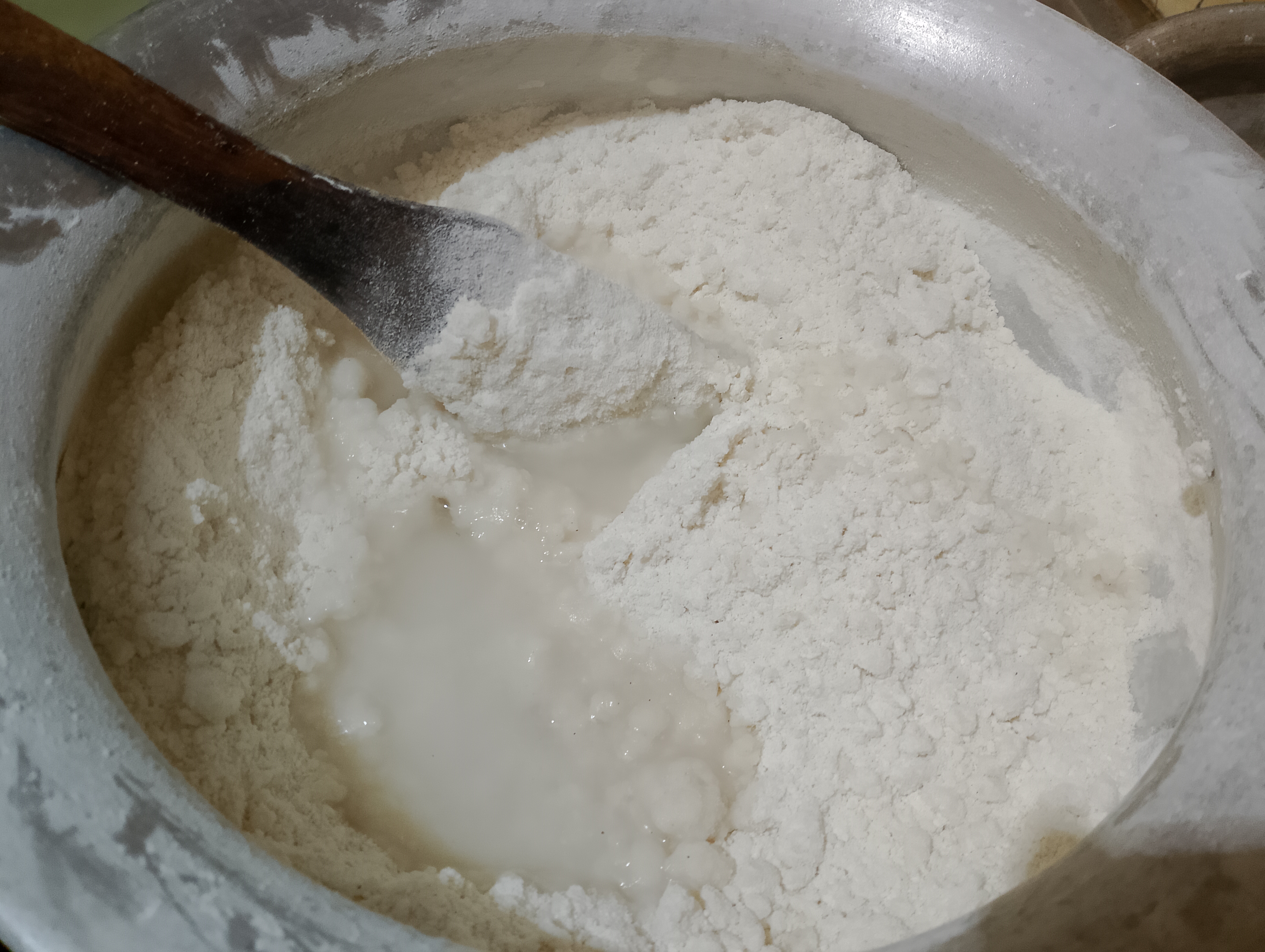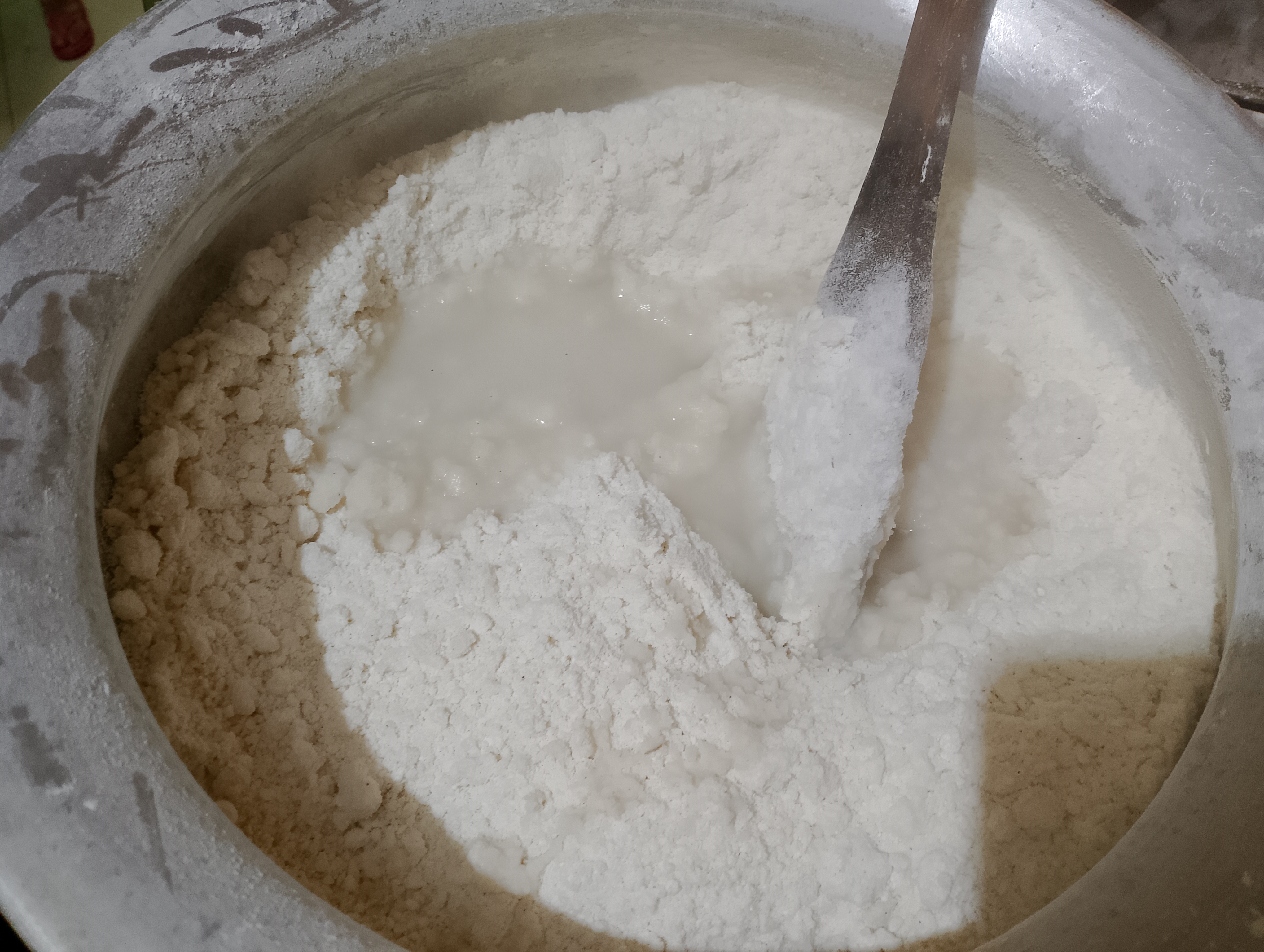 কিছুদিন আগে গ্রাম থেকে আসার সময় সঙ্গে করে চাউলের গুড়ো নিয়ে এসেছিলাম। গ্রামের চাল দিয়ে তৈরি গুড়োর গন্ধ আর মান শহরের গুড়োর থেকে একেবারেই আলাদা। প্রথমে চাউলের গুড়ো ভালোভাবে চালনি দিয়ে চেলে নিলাম, যেন কোনো দানা বা ময়লা না থাকে। এরপর চুলায় আগুন জ্বালিয়ে একটি পাতিল বসানো হলো। সেই পাতিলে গুড়োগুলো হালকা করে গরম করে নেওয়া হলো।