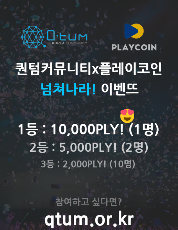퀀텀커뮤니티x플레이코인 '넘쳐나라' 이벤트 하네요.zilpung (28)in #playcoin • 8 years ago 방법은 다음과 같습니다. 큐바오 앱을 다운로드 받고, 플레이코인 채팅방에 입장합니다. 퀀텀 텔레그램방에 입장합니다. 해당 이벤트를 본인의 SNS 및 커뮤니티에 올려주세요! 3가지 모두 완료 후 퀀텀 커뮤니티의 "이벤트-퀀텀커뮤니티x플레이코인" 게시판의 "인증 공지"를 참고하여 PLY 주소와 함께 적어주시면 완료네요. #qtum