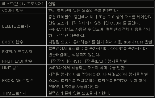 : 컬렉션 메소드는 sql에서는 이용할 수 없고, pl/sql 프로그램에서만 이용 가능