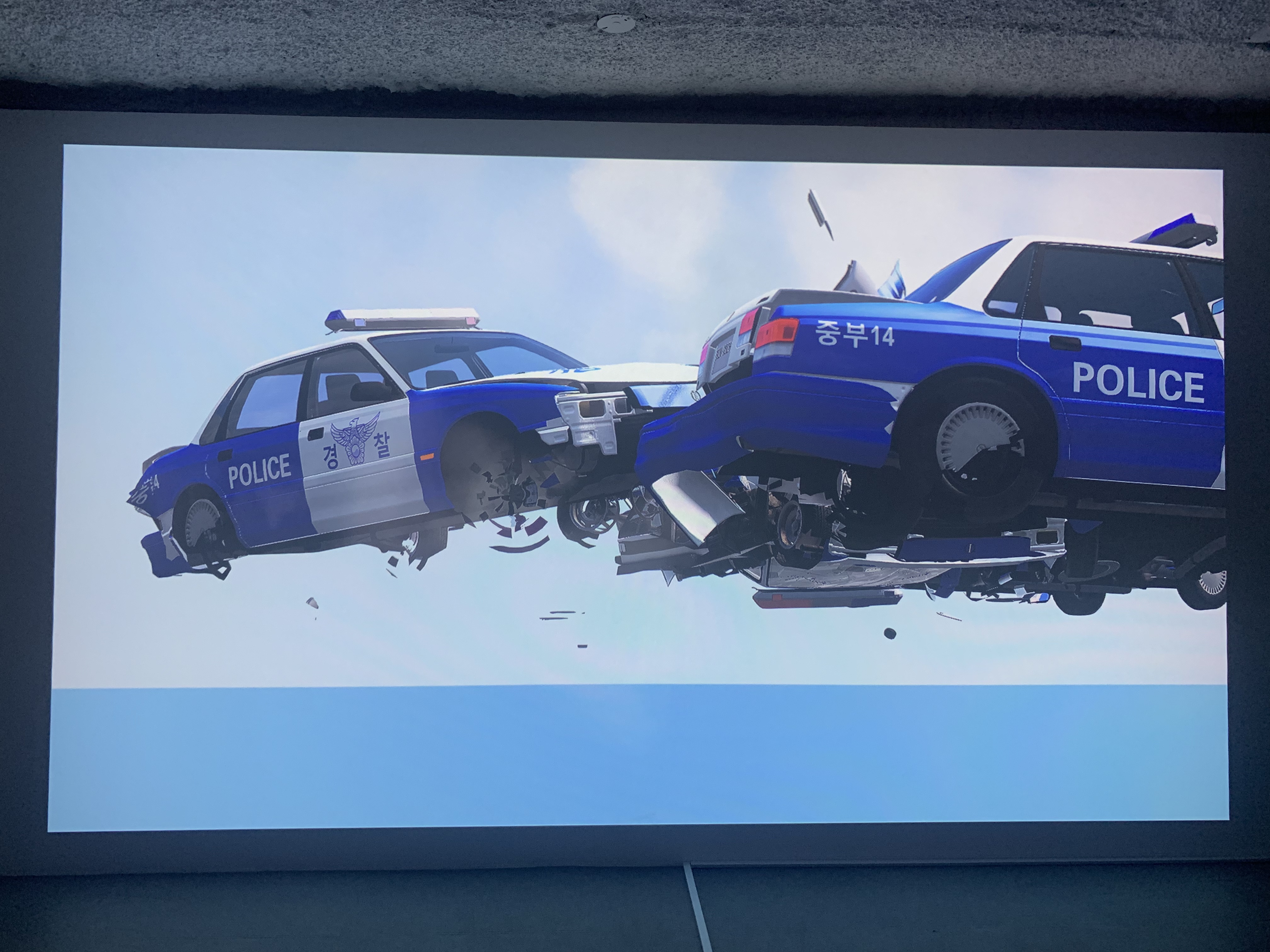 그 경찰들이 탄 경찰차가 어지럽게 사고가 난다.