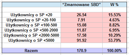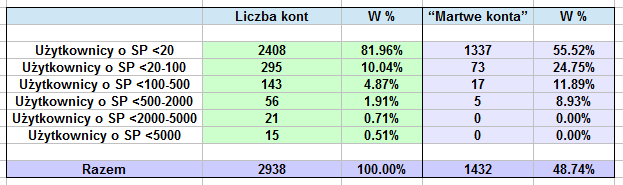 Brane są pod uwagę konta użytkowników, które dodały przynajmniej jeden wpis na polskich tagach, a więc nie ma tu przypadków typu założył konto, czekał miesiąc na aktywację i zapomniał. Ze statystyk wynika, że ponad połowa (55%) nowych kont (z SP poniżej 20, a jest to ponad 80% użytkowników #polish) nie oddała głosów przez ostatni miesiąc. Nie UpVotuje również co czwarty z użytkowników z SP pomiędzy 20-100, co ósmy z SP pomiędzy 100-500 i co jedenasty z SP pomiędzy 500-2000.