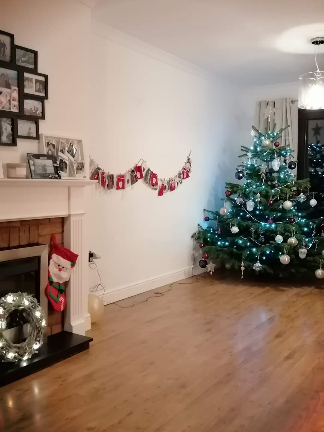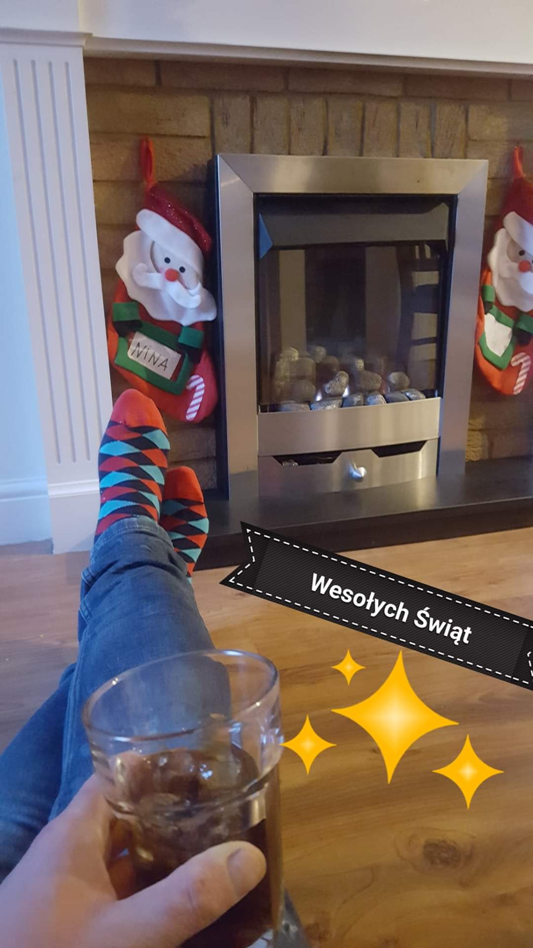 Na zewnątrz było już dość ciemno. Ubralismy się i wyszliśmy na miasto w kierunku placu gdzie stoi choinka. W zeszłym roku większość ludzi z miasteczka miało ustrojowe pięknie domy. Dziś spacerowaliśmy ciemnymi ulicami. W lokalu zjedliśmy pizze i wracając do domu trochę ganialiśmy się ponieważ chciałem dzieci trochę wymęczyć żeby wcześniej poszły spać co udało mi się. Następnie zaczęło się potajemne pakowanie prezentów. Gdy skończyliśmy zrobiłem sobie drinka by móc choć przez chwilę usiąść i się zrelaksować.