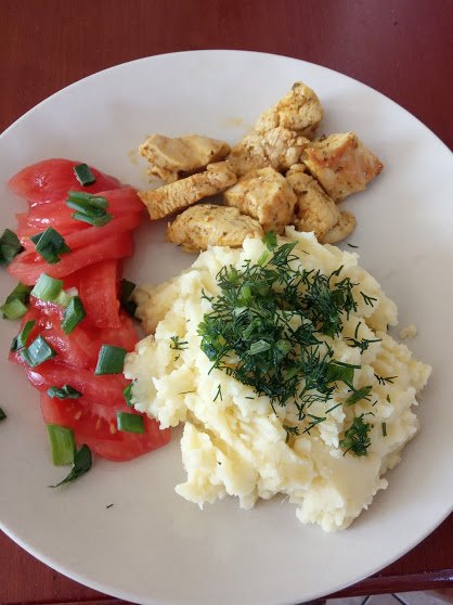To będzie szybkie i smaczne. Kurczaka kroje w kosteczkę taką grubszą. Doprawiam przyprawą tajską, kurkumą, papryką i solą i pieprzem oraz olejem. Dobrze mieszam i fajnie zostawić to chociaż na godzinę a najlepiej na całą noc w lodówce. Potem szybko podsmażam na gorącej, bardzo gorącej patelni. Ściągam z ogniem i patelnię przykrywam szczelnie folią aluminiową i zostawiam na 10 minut. Mięso dojdzie i będzie mięciutkie. Trzeba tylko pamiętać żeby szybko obsmażyć a potem przykryć i zostawić i samo dojdzie, gwarantuje. U mnie dzisiaj prosto ziemniaki pure i pomidor ze szczypiorkiem. Młodzieży zażyczyła sobie do tego frytki, nie zdążyłam zrobić zdjęcia, więc moja zdrowsza i smaczniejsza wersja z pure. SMACZNEGO