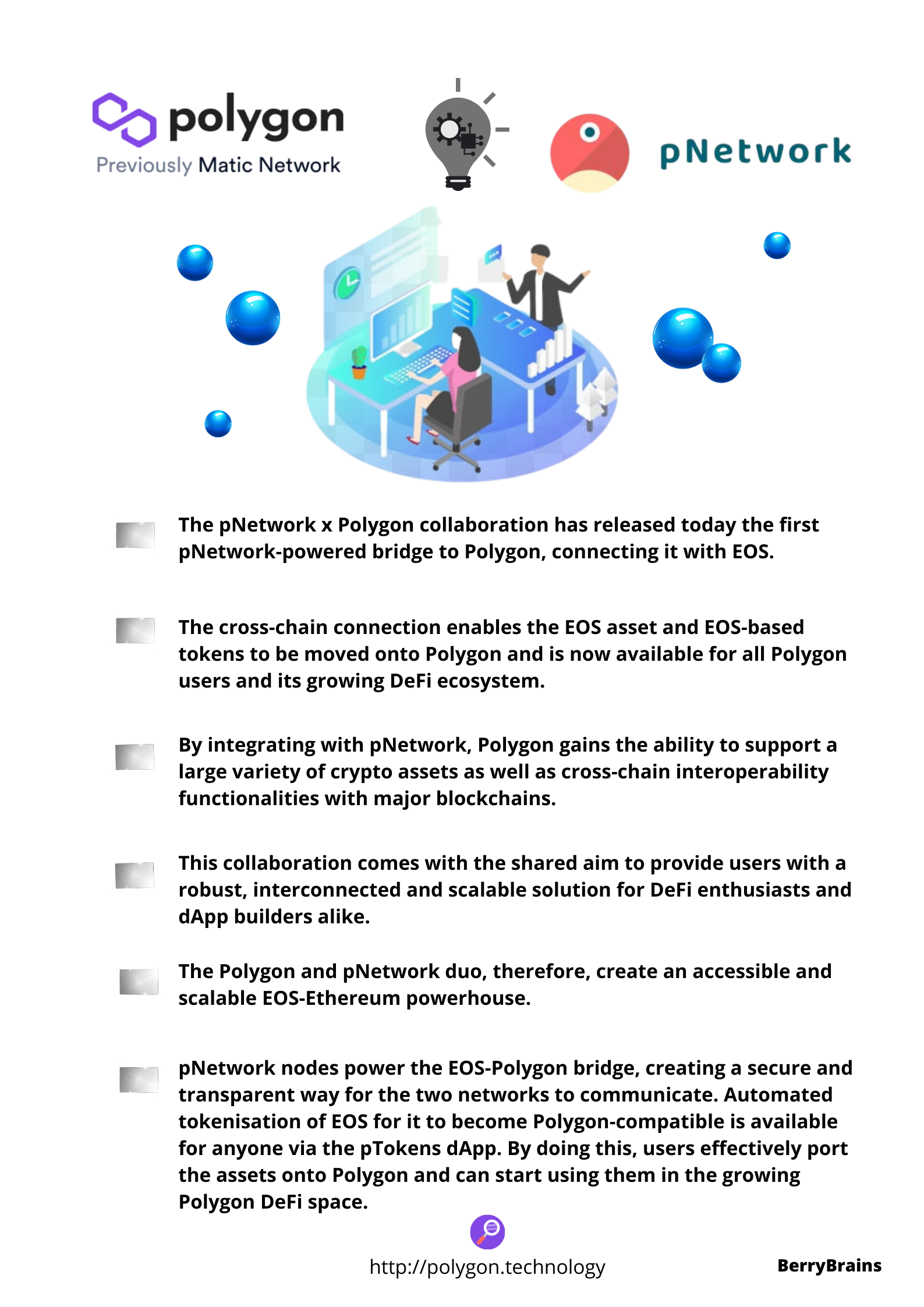 Polygon integrates pNetworkberrybrains (25)in #polygondefi • 5 years ago Polygon has launched the first EOS-Polygon cross-chain Bridge which is powered by pNetwork This collaboration is set to bring accessibility, scalability and security to assets on EOS. Learn more about the integration in the attached infograph.
