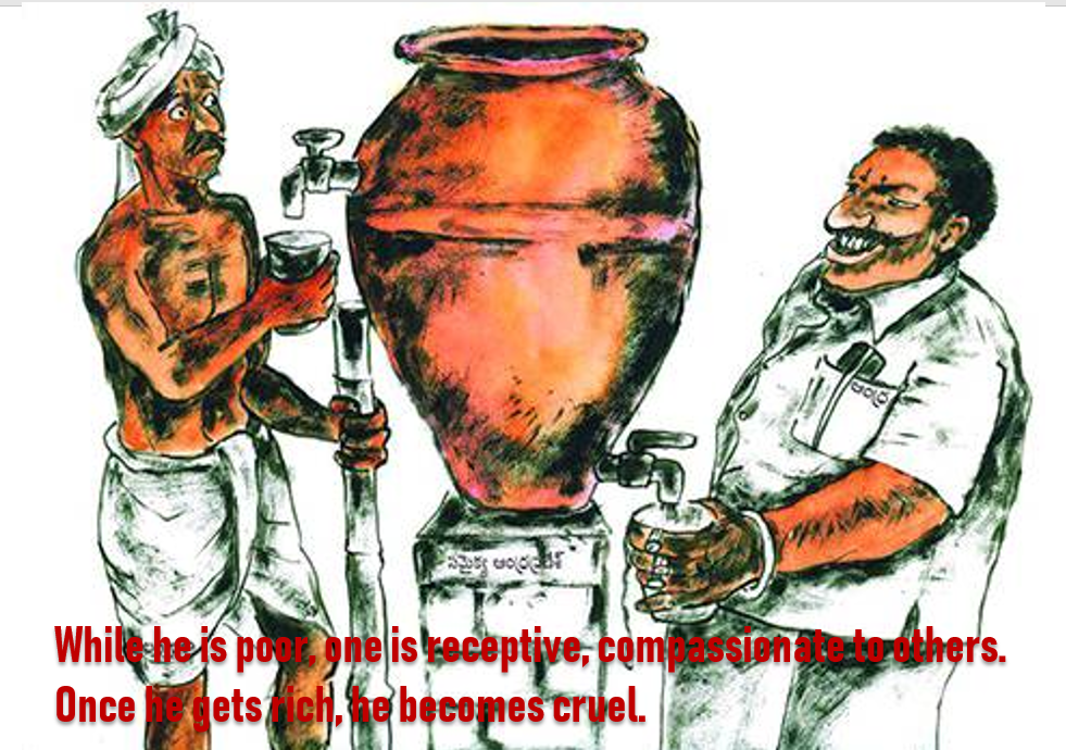 While he is poor, one is receptive, compassionate to others. Once he gets rich, he becomes cruel.