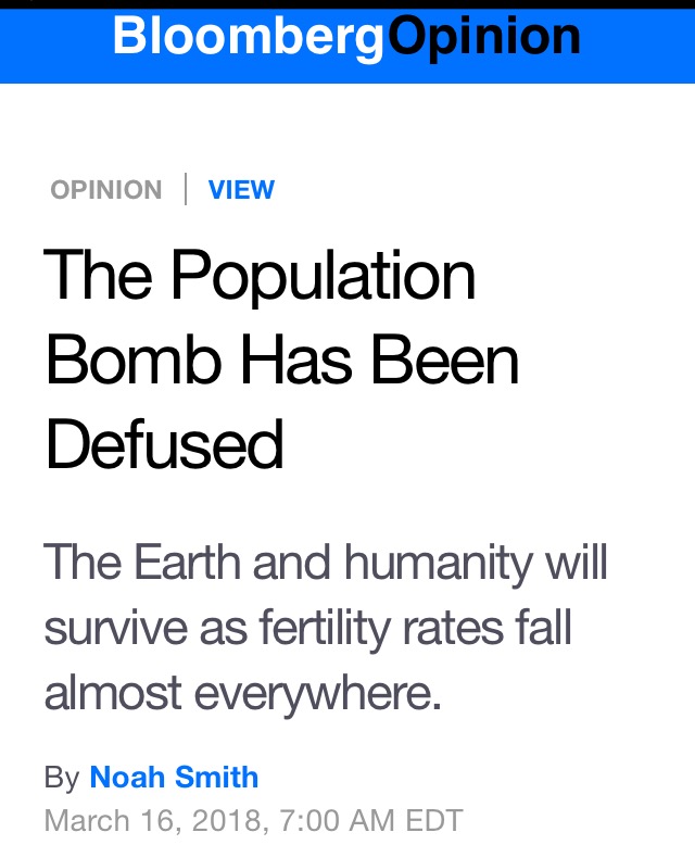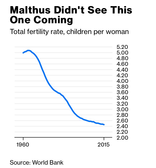 Fortunately, this is happening. During the lifetimes of Malthus and Ehrlich, humans still tended to have large families, with each woman bearing an average of five children over her lifetime. But shortly after Ehrlich’s book, that began to change:" Source