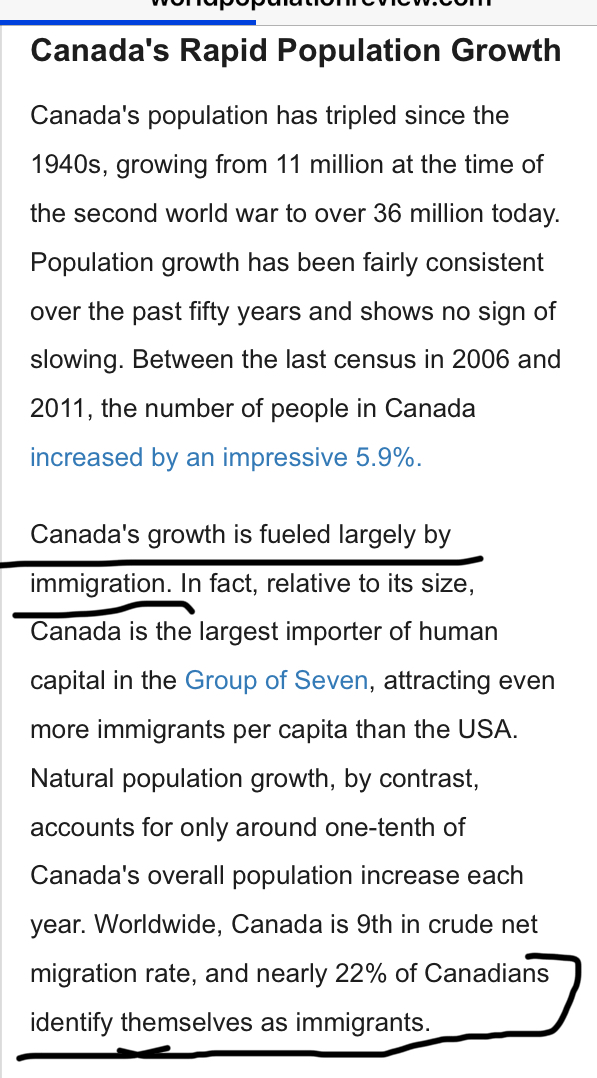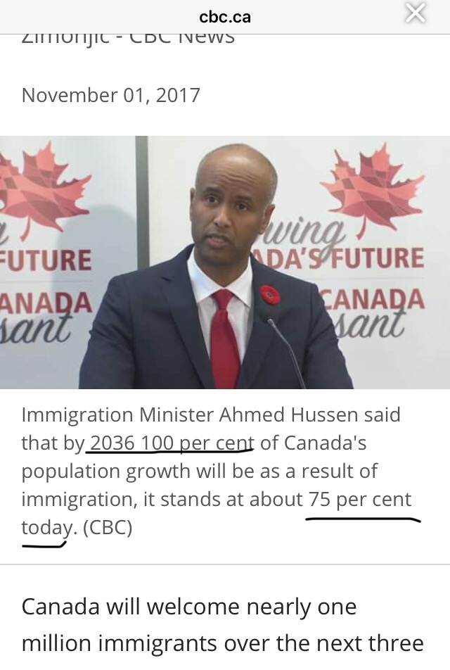 ”Immigration Minister Ahmed Hussen said "that by 2036 100 per cent of Canada's population growth will be as a result of immigration, it stands at about 75 per cent today."