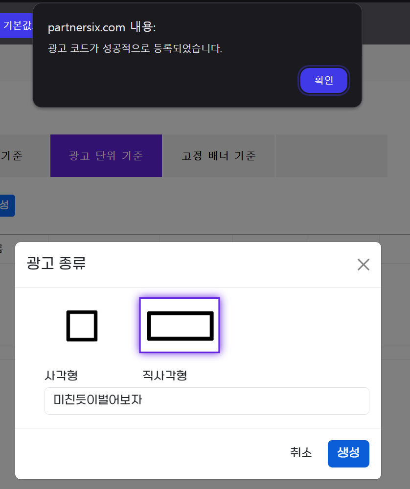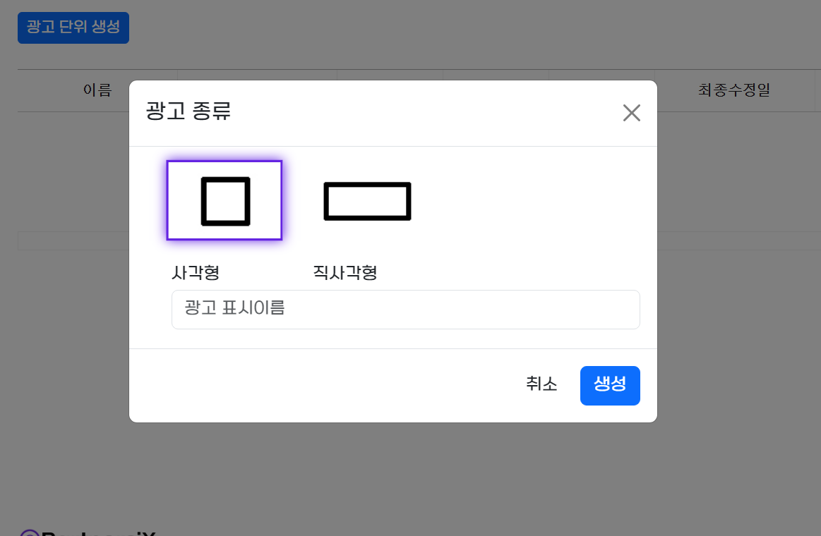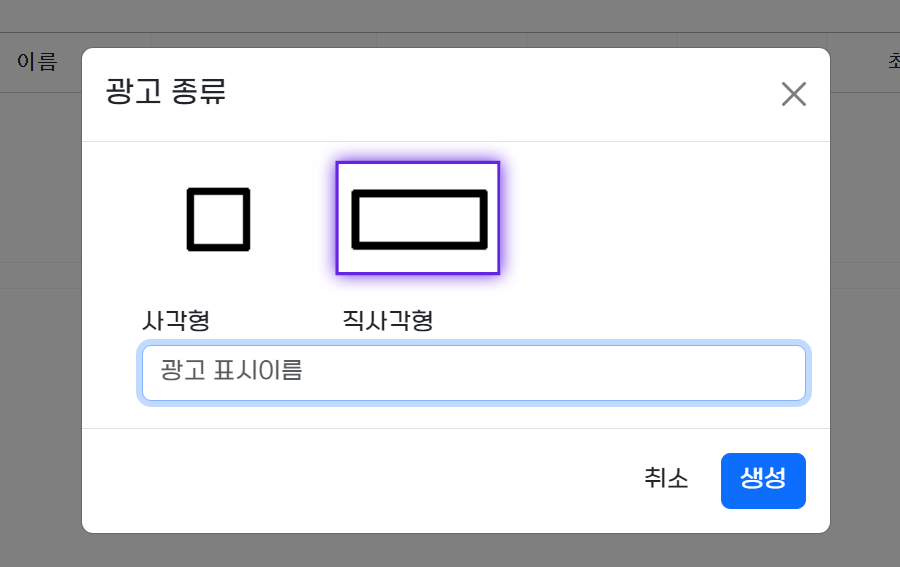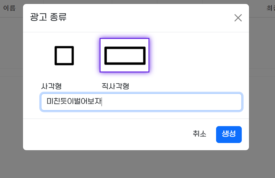 광고 코드는 직사각형으로 선택하세요