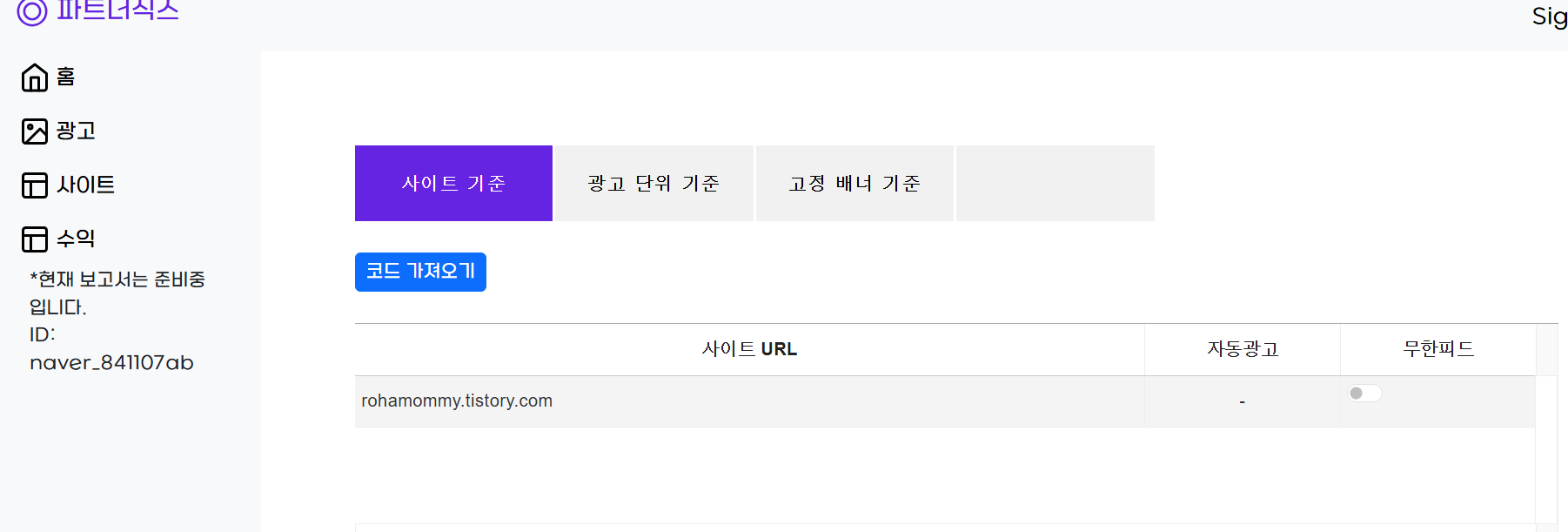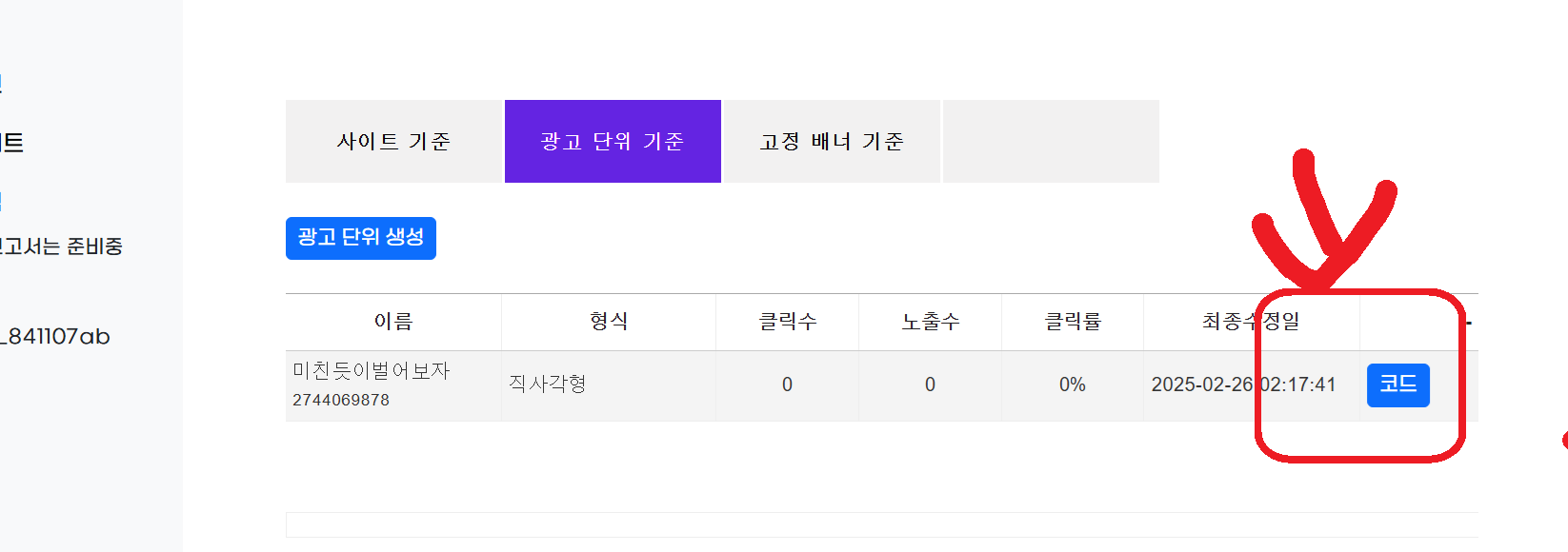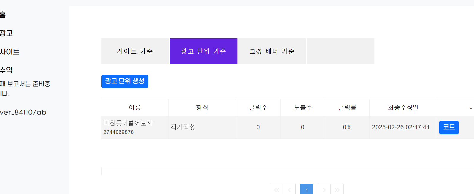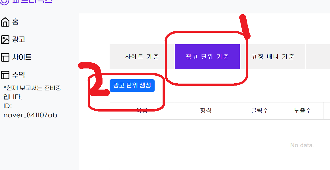 이제 2번 광고단위생성을 눌러서 광고코드를 만들겁니다.