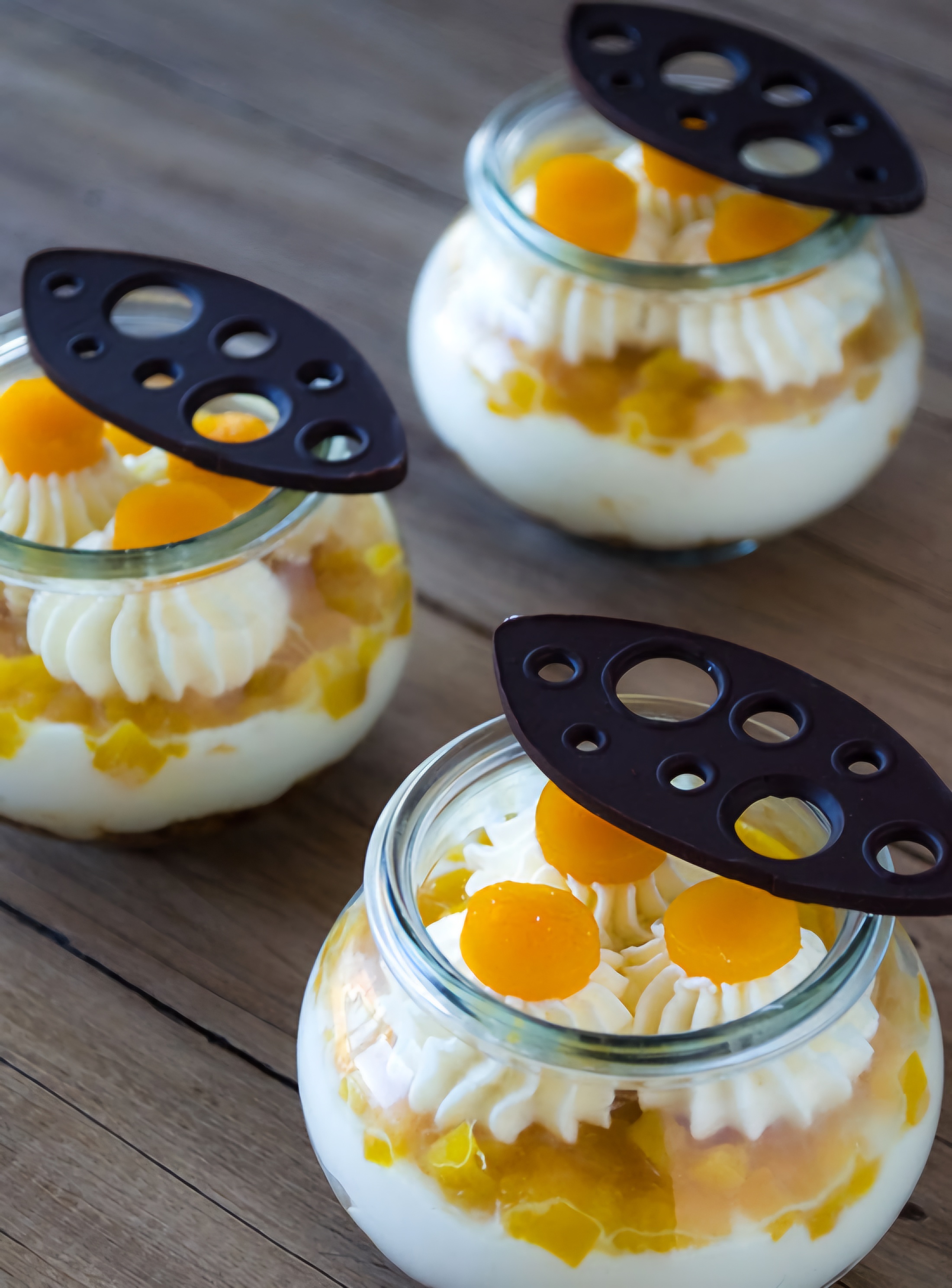 Cortamos el bizcocho en dados pequeños, rellenamos la base de los vasos con estos dados y añadimos un poco de almíbar de café, a continuación dividimos la crema de queso en dos mangas, una la ponemos con boquilla lisa y la otra con una boquilla Wilton 6B, con la manga de boquilla lisa rellenamos el vaso más o menos hasta la mitad del vaso, seguidamente colocamos una capa de dados de mango, después colocamos tres puntos con la otra manga, cortamos tres círculos de gelatina de mango con ayuda de un cortapastas y los colocamos sobre los tres puntos de crema de queso