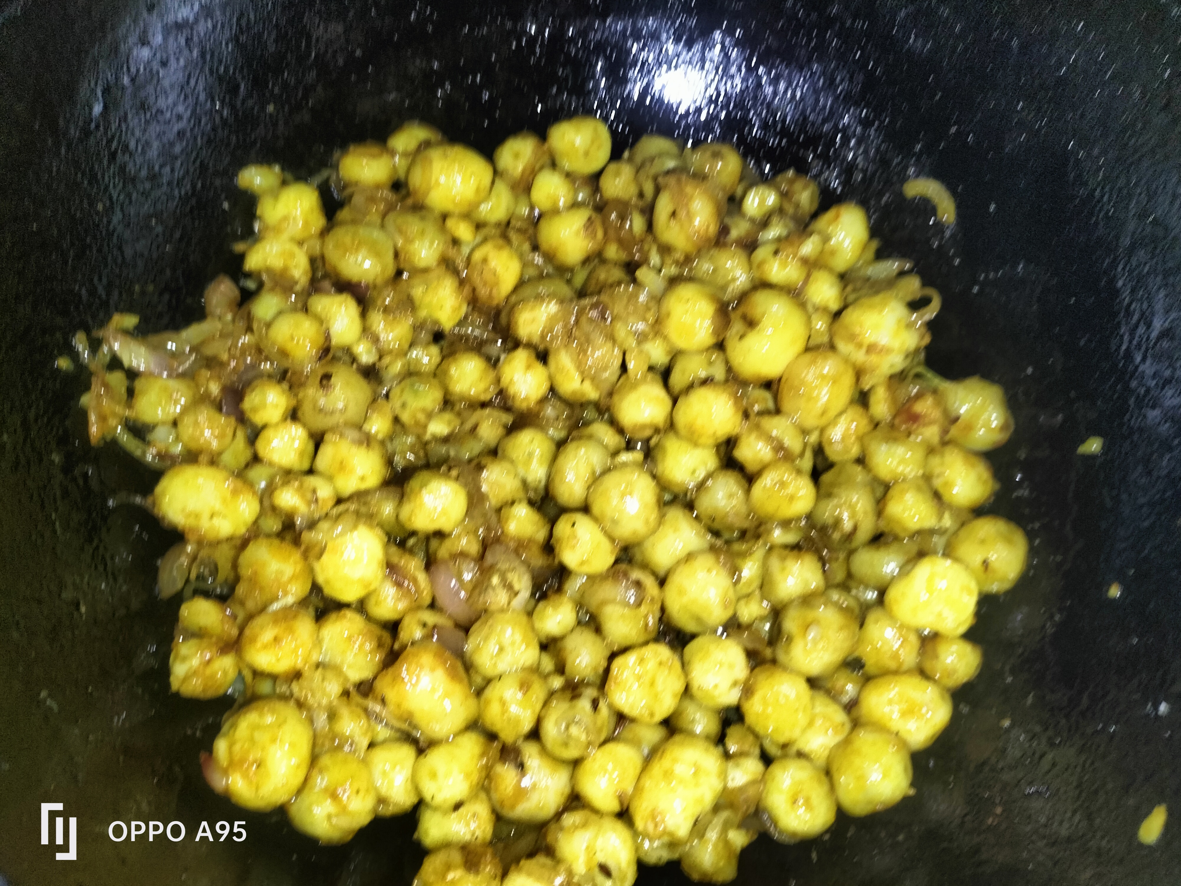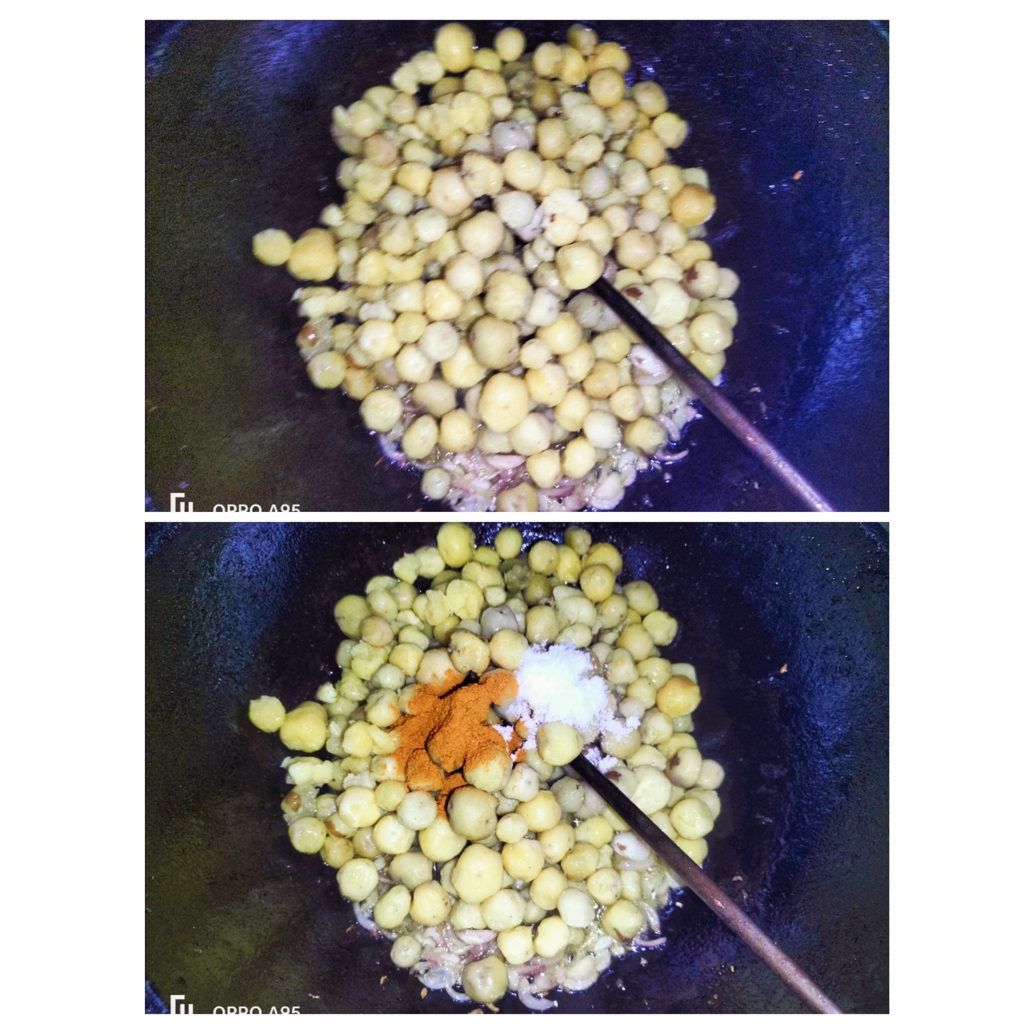 এখন আলু গুলো কড়াইয়ে দিয়েছিও তাতে পরিমাণ মতো লবন হলুদ দিয়েছি।
