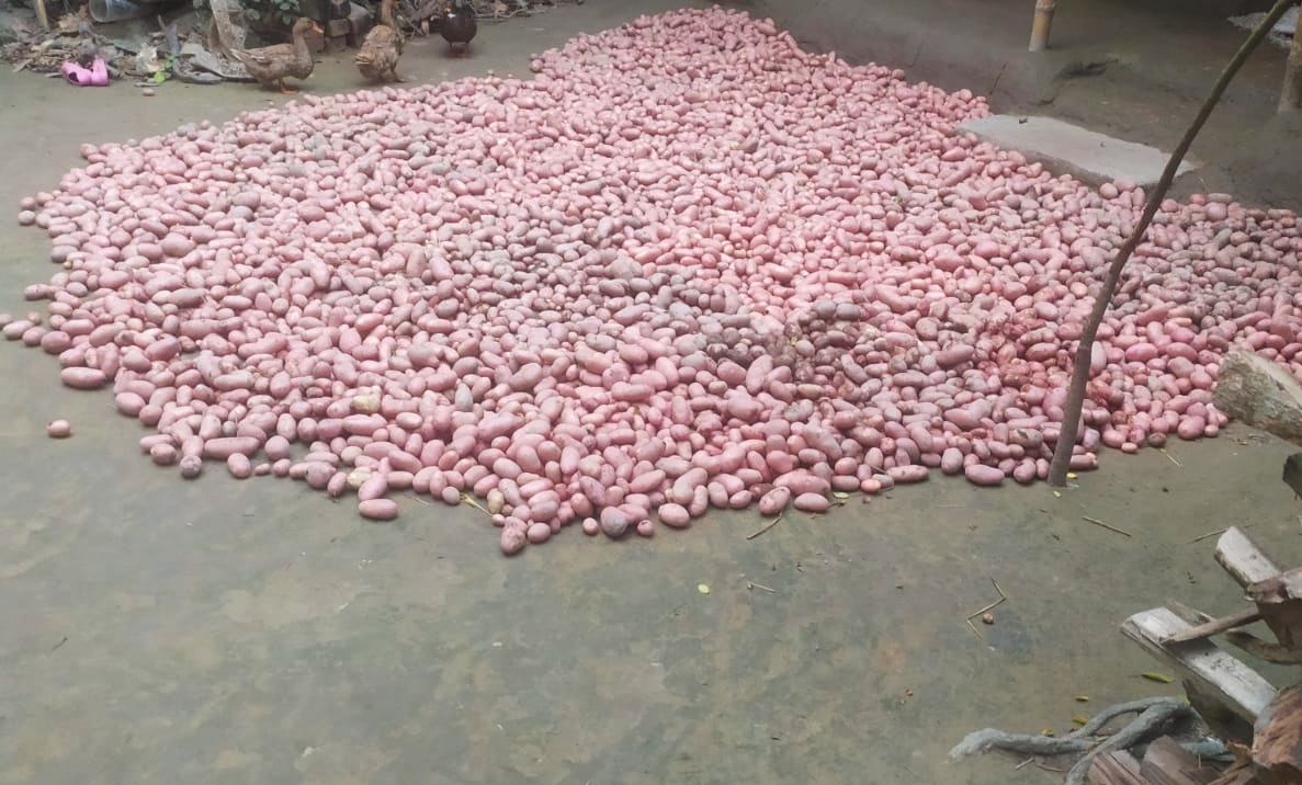 এখন রোদে শুখানো আলু গুলো রোদে শুখিয়ে বস্তাবন্দি করে নেওয়া হয়েছে ও বস্তুা ভর্তি করে হিমাগারে পাঠানো হয়েছে।
