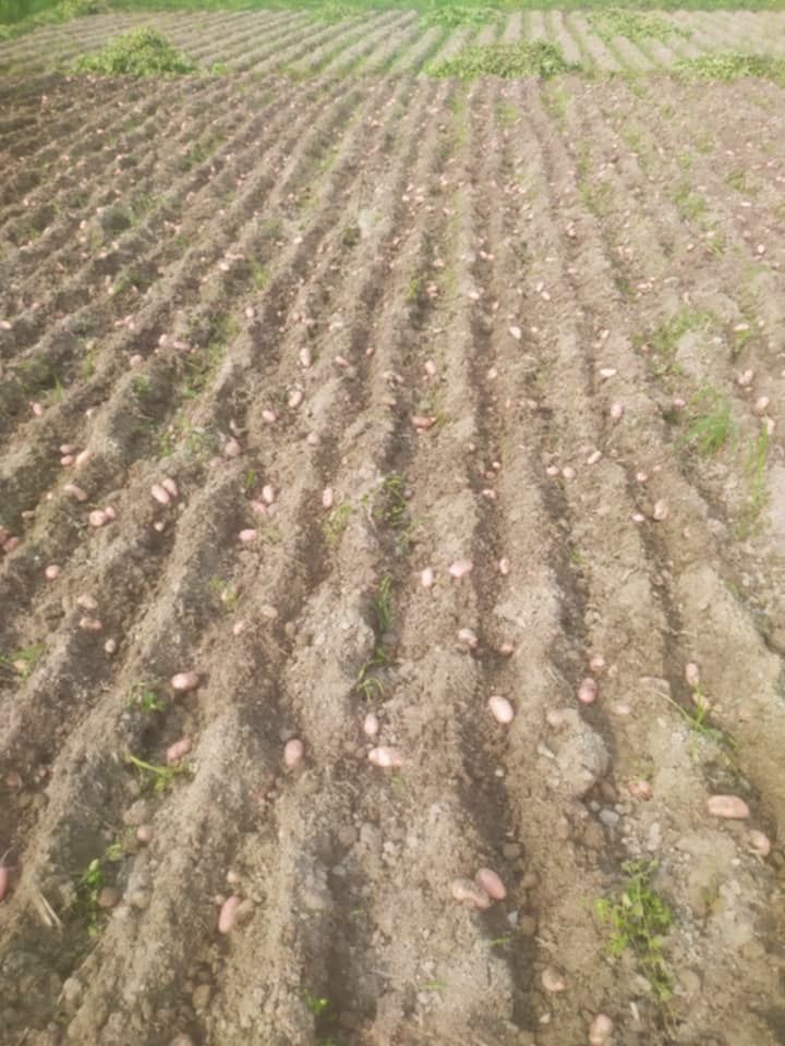 এখন দু’পাশের মাটি এক করে উঁচু করতে হয় মানে মাঝে উচু কাঁন্দি থাকবে আর ড্রেনে রুপান্তরিত হবে।এই উচু কান্দির ভিতরে একটুকরো করে আলু দিয়ে মাটি চাপা দেয়া হয়েছে। চার থেকে পাঁচ ইন্চি অন্তর অন্তর এই আলু মানে বীজের আলুর টুকরো দিয়ে ঢাকা দেয়া হয়েছে।