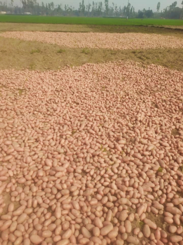 আলু তুলে তুলে জমিতেই মেলে দেয়া হয়েছে রোদে।রোদে আলু গুলো বেশ ভালো ভাবে শুখে গেছে। আলুর শরীরের যে রস থাকে তা আলু রোদে দেয়ার পর শুখে নেয়া হলে খুবই ভালো হয়।বাড়িতেও রোদে শুখিয়ে সংরক্ষণ করা যায়। তবে এখন হিমাগারে আলু সংরক্ষণ করা হয়ে থাকে।