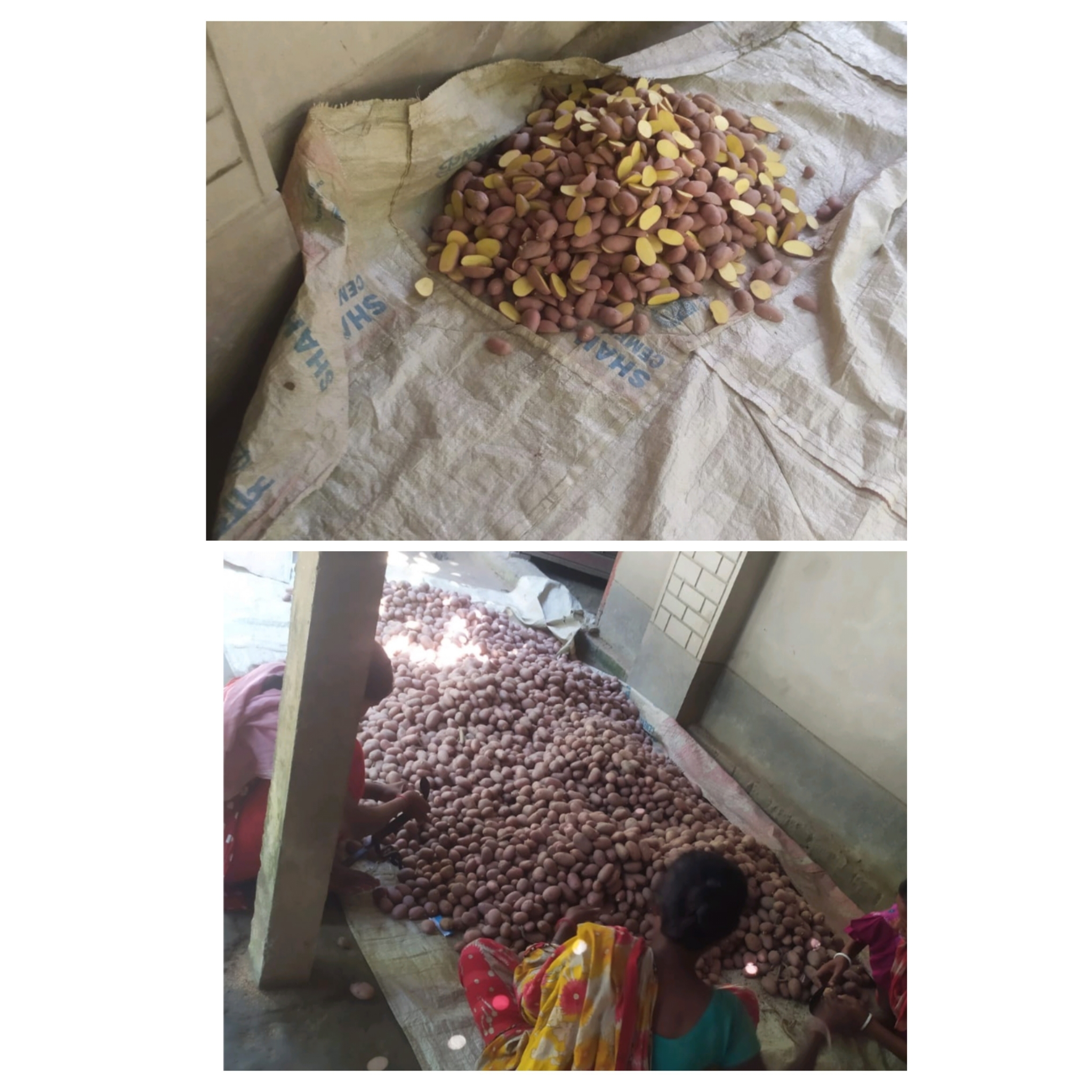 এখন আলু লাগানোর জন্য আলুর বীজ তৈরি করা হচ্ছে।আলুর বীজ আলাদা রাখতে হয় বা কিনতে পাওয়া যায়।আলুর বীজ বলতে বলেন বিশেষ ধরনের গোটা আলু বিজ হিসেবে রেখে থাকে।সেই গোটা আলু আবার কেটে দুই খন্ড বা চার খন্ড করা হয়।এখন আপনারা আমার ফটোগ্রাফিতে দেখতে পারবে আলুর বীজ কাটার দৃশ্য।আপনারা নিশ্চয়ই দেখতে পারছেন কয়েকজন মহিলা শ্রমিক আলুর বীজ গুলো দুখন্ড করছে।আমাদের এলাকায় এরকম মহিলা শ্রমিক পাওয়া যায়।মহিলা শ্রমিকেরা পরিবারের সচ্ছলতা আনার জন্য শ্রম দিয়ে থাকেন। বিশেষ করে আলু তোলা,আলু লাগানো এসব কাজে পারদর্শী বেশি।বসে বসে এসব কাজ করতে মহিলারা সাচ্ছন্দ্য বোধ করে থাকেন তাই দিনদিন মহিলা শ্রমিকদের পরিমান বৃদ্ধি পাচ্ছে।