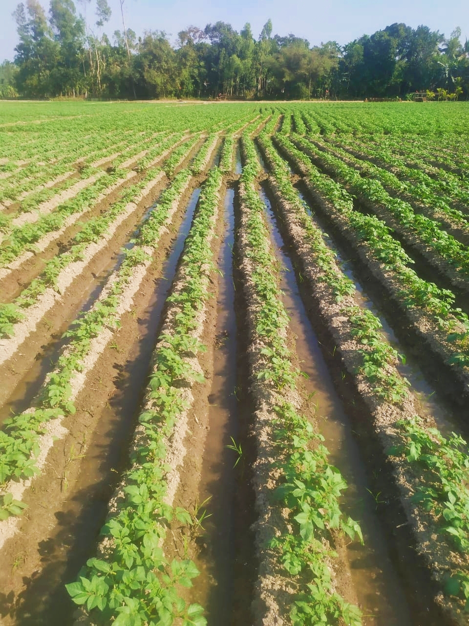 কিছুদিন পর আলুর চারা গুলো খুব সুন্দর ভাবে বেড়ে উঠেছে এবং সবুজ হয়ে গেছে পুরা জমিটি।এখন আলুর জমিতে যে ড্রেন থাকে পুতিটি কান্দিতে সেখানে সেচ দেওয়া হয়েছে।
