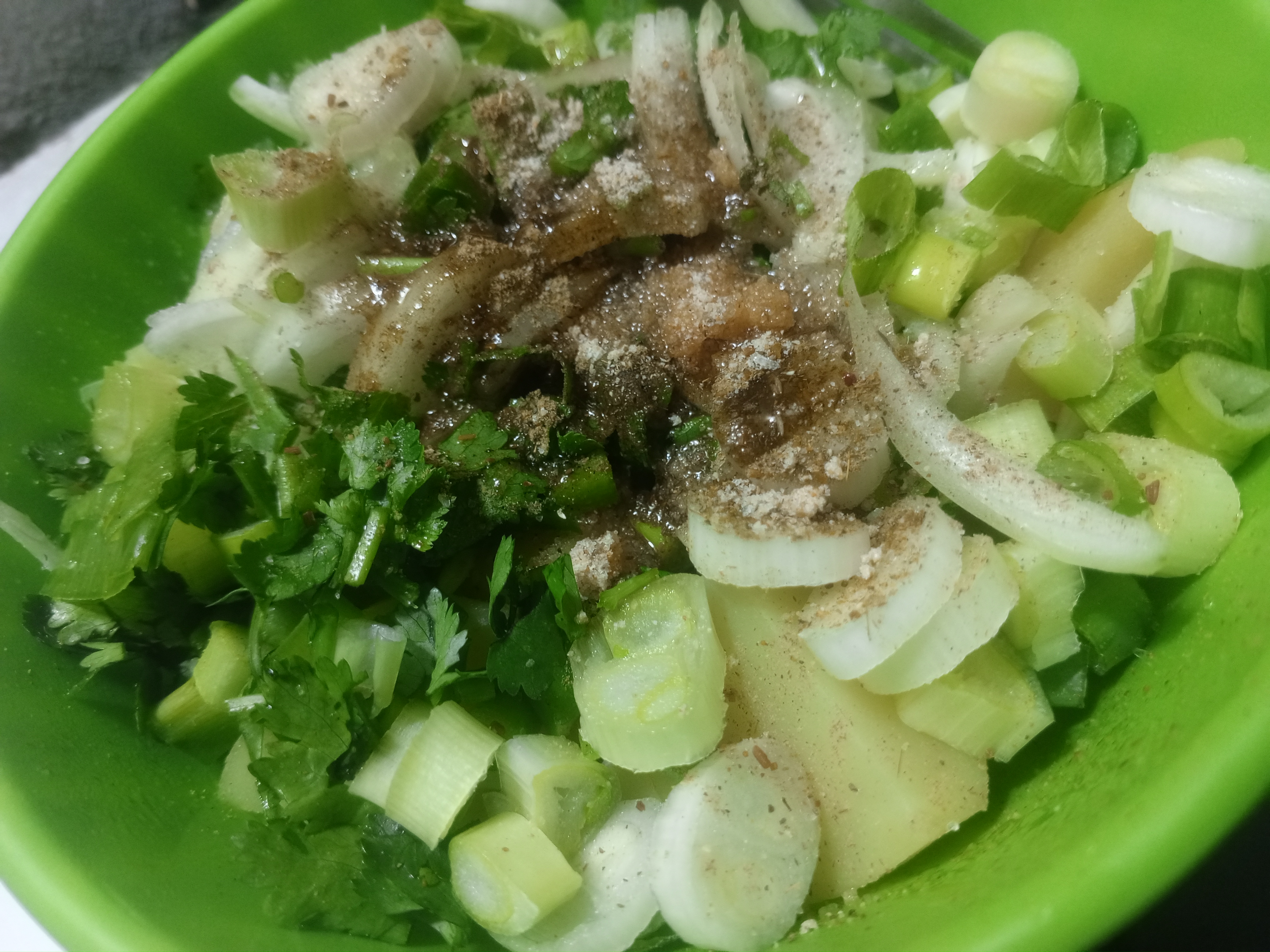 Al estar cocidas, las llevé a un recipiente para integrarlas con el cilantro, cebolla y cebollín previamente cortados, además de agregar los condimentos, el aceite e integrar todo hasta formar una masa.