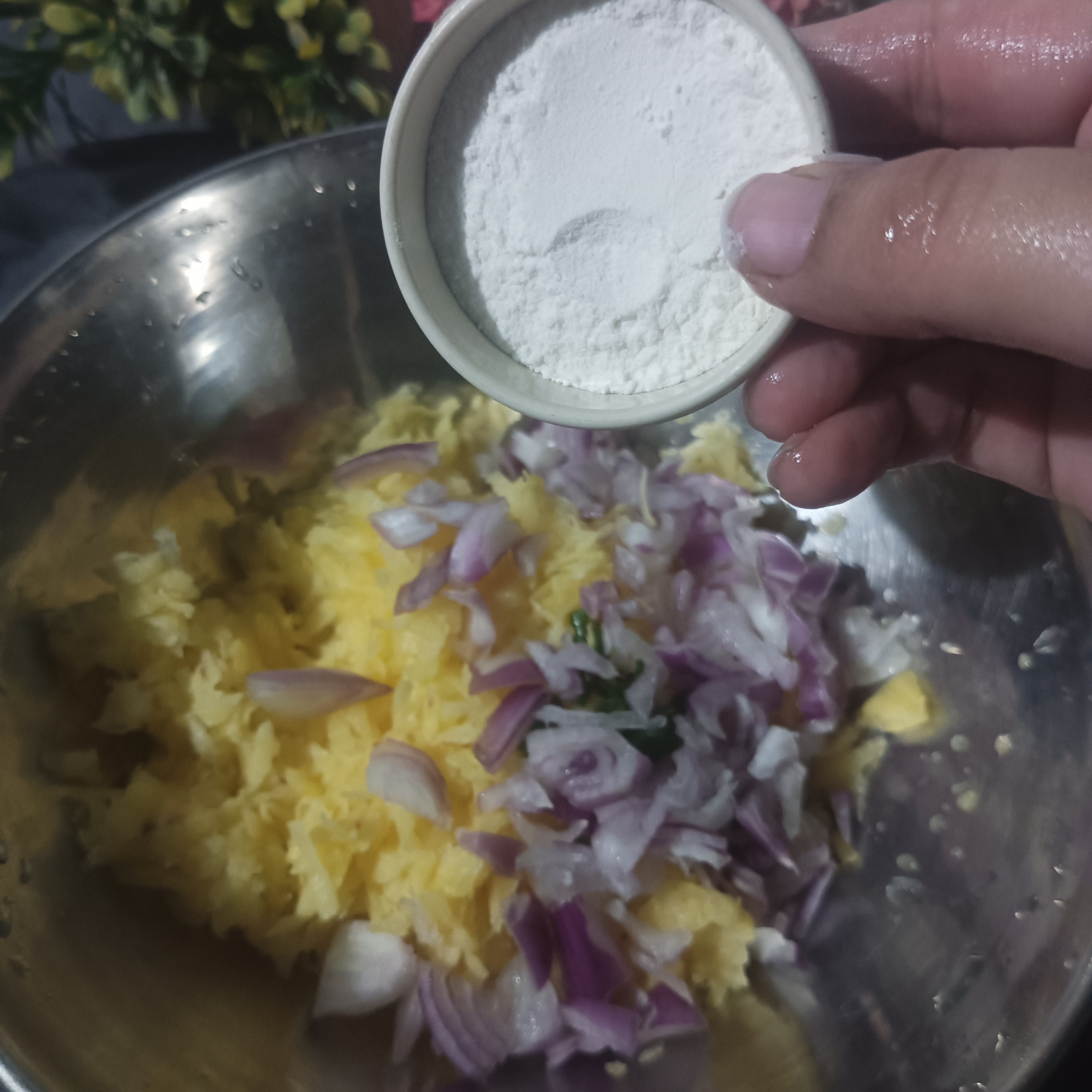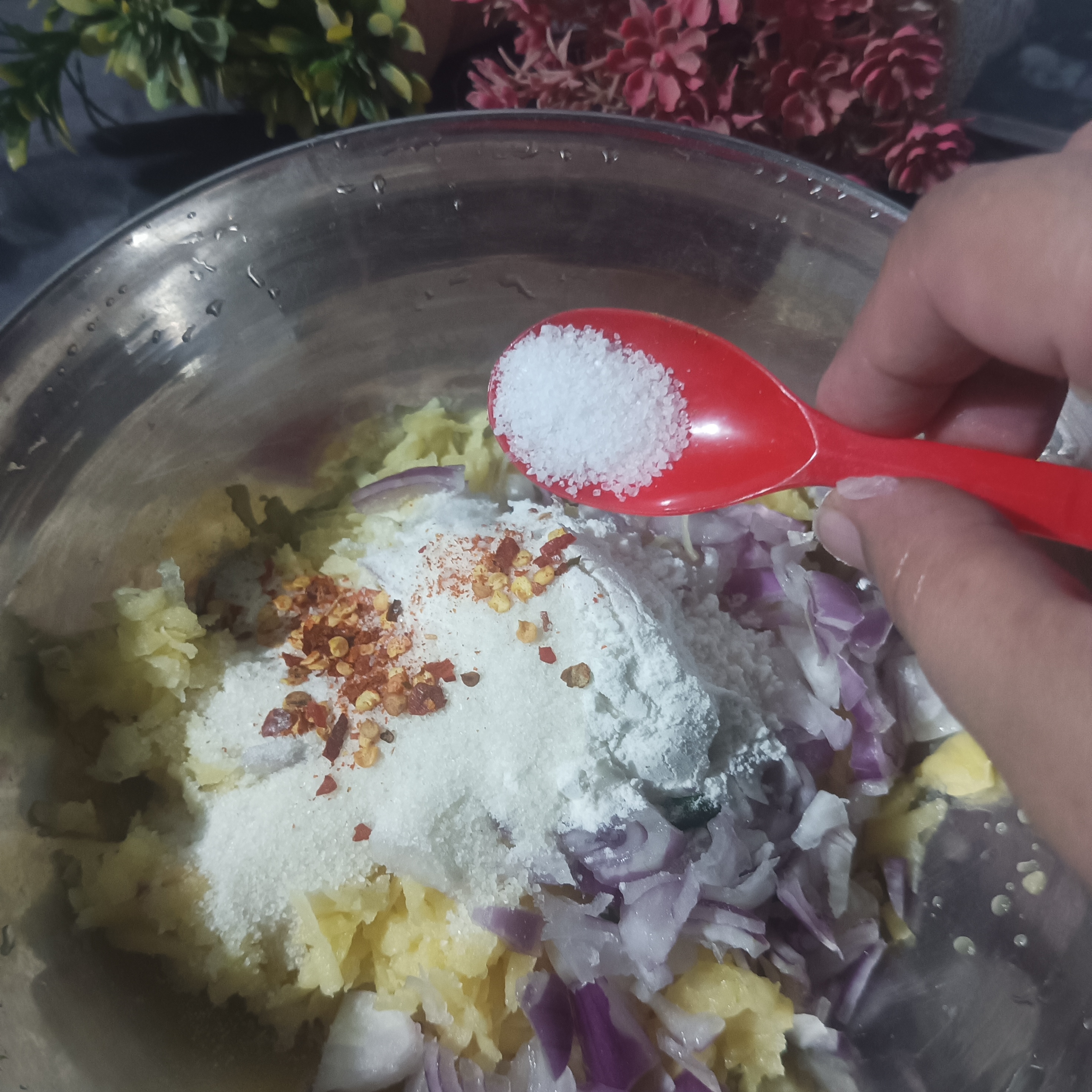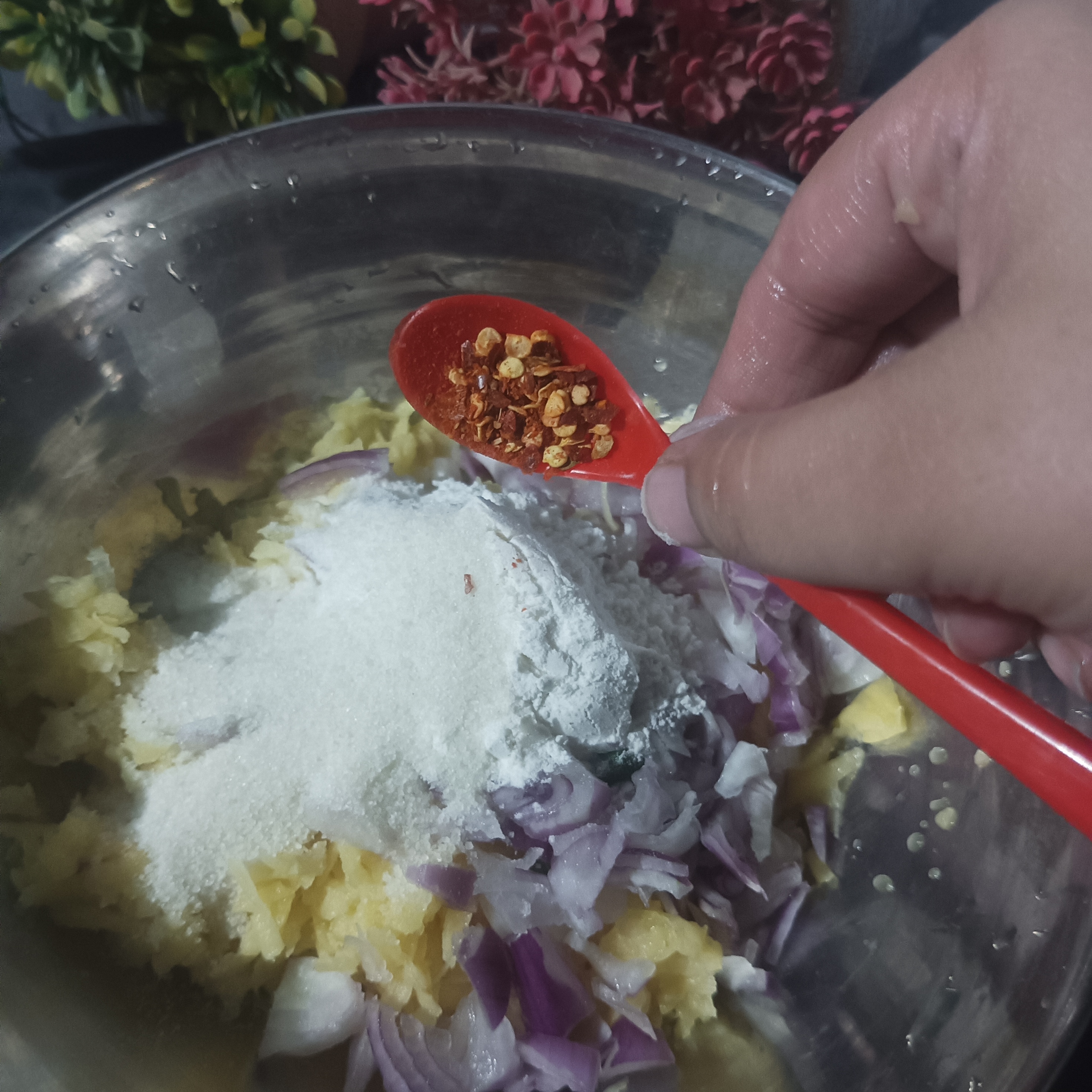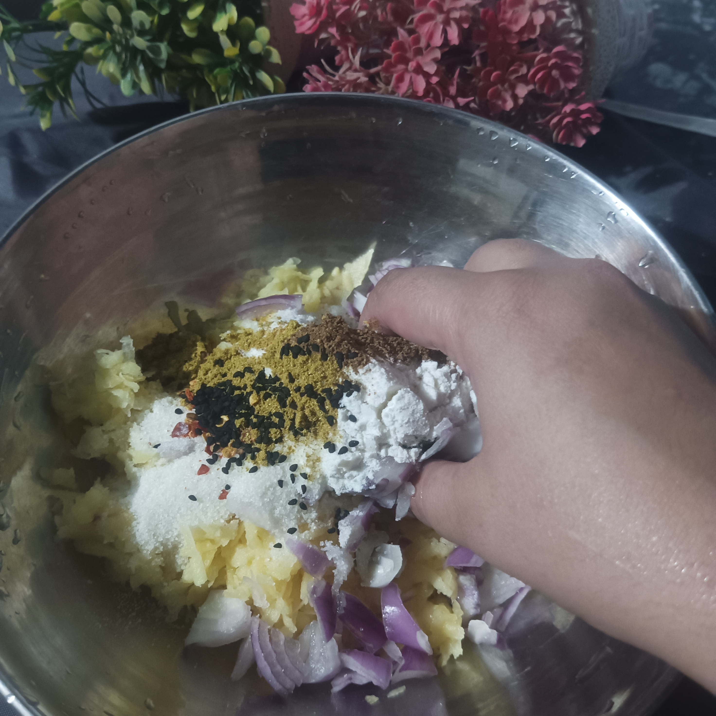 Now we are going to make the mixture of Potatoes Pakora. For this , we will add all the spices and chopped veggies into dry grater potato's step by step and mixed it with soft and gently hands.