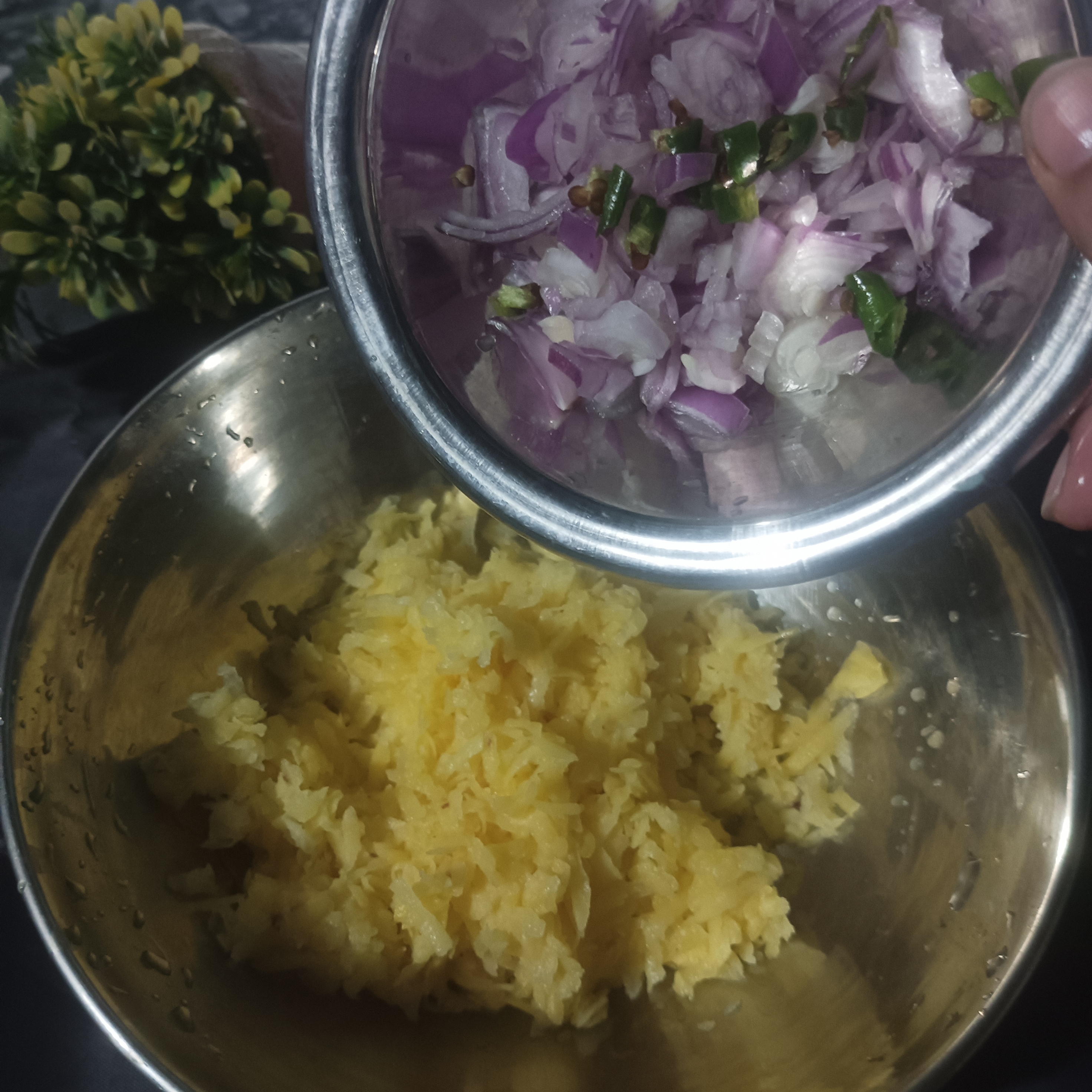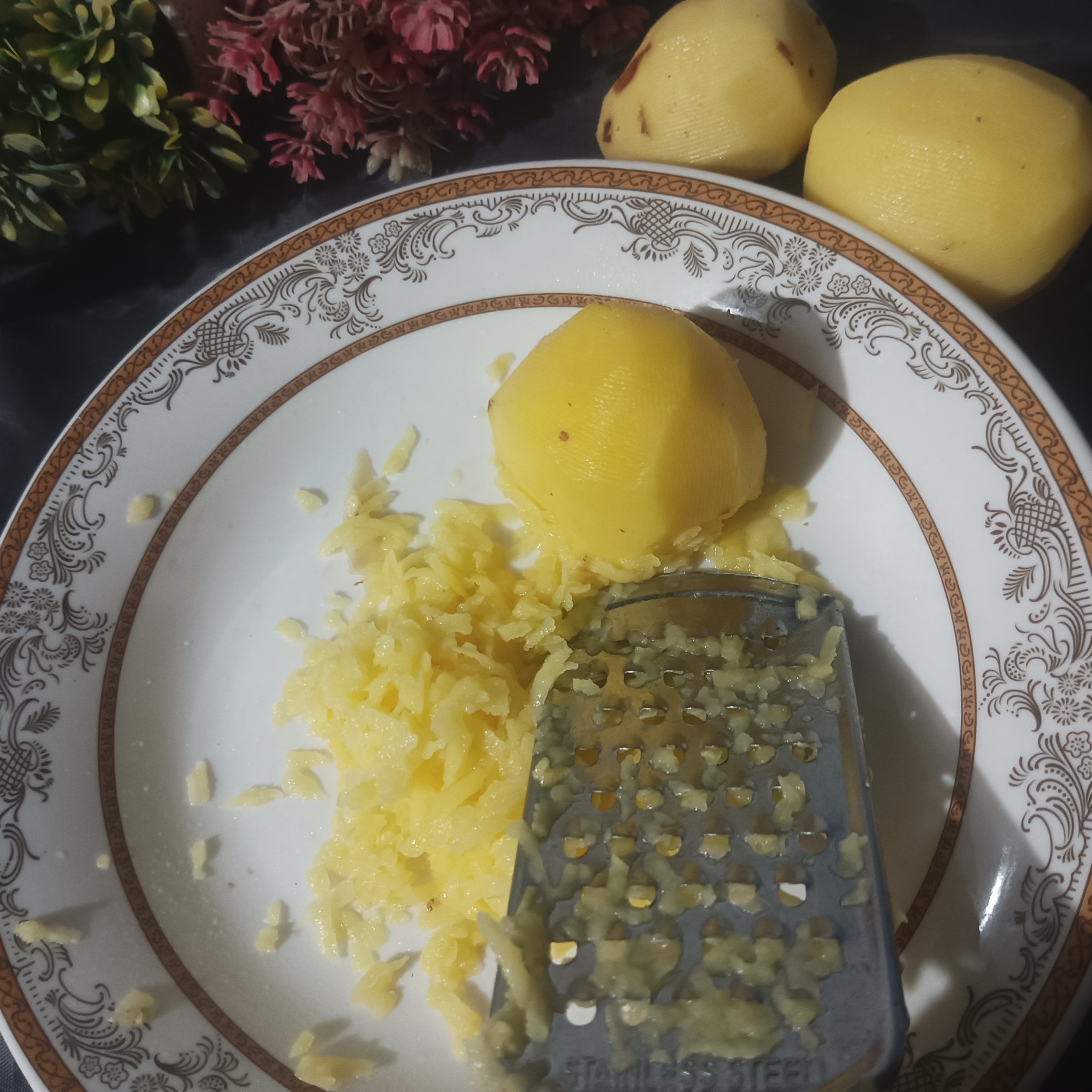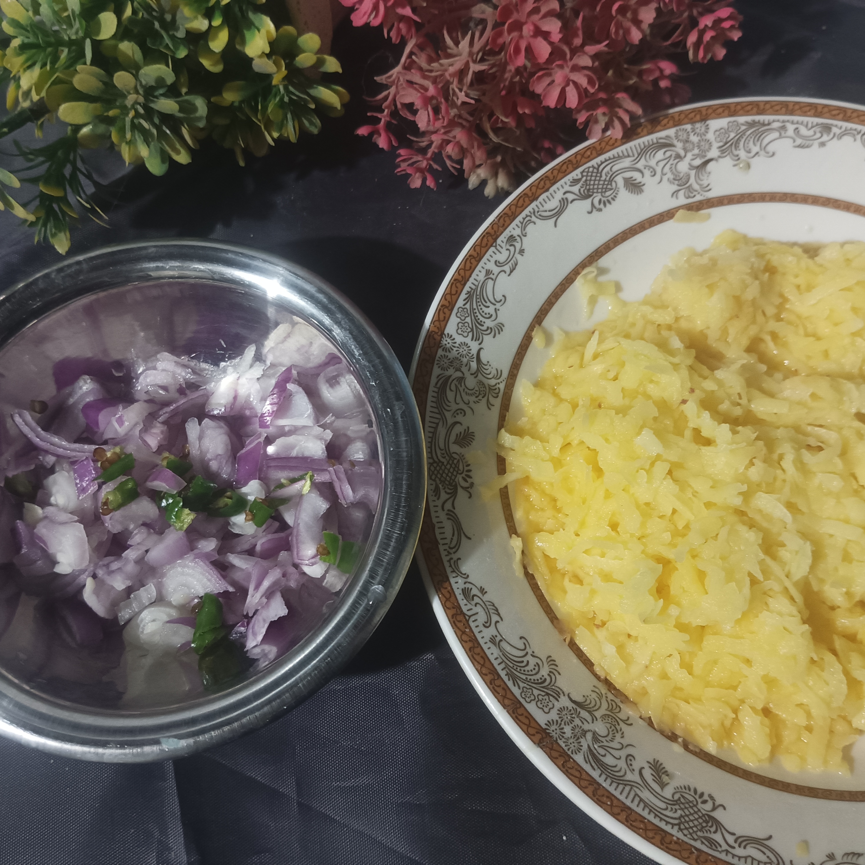 I firstly washed potato's with the fresh flowing water. Then I have used my kitchen utensils Knife , peeler and mini-grated. With the peeler , I peel the outer skin of potatoes and then by using mini- grater I grated the potato's. Then by using knife , I chopped onion into small pieces and cut the green chillies.