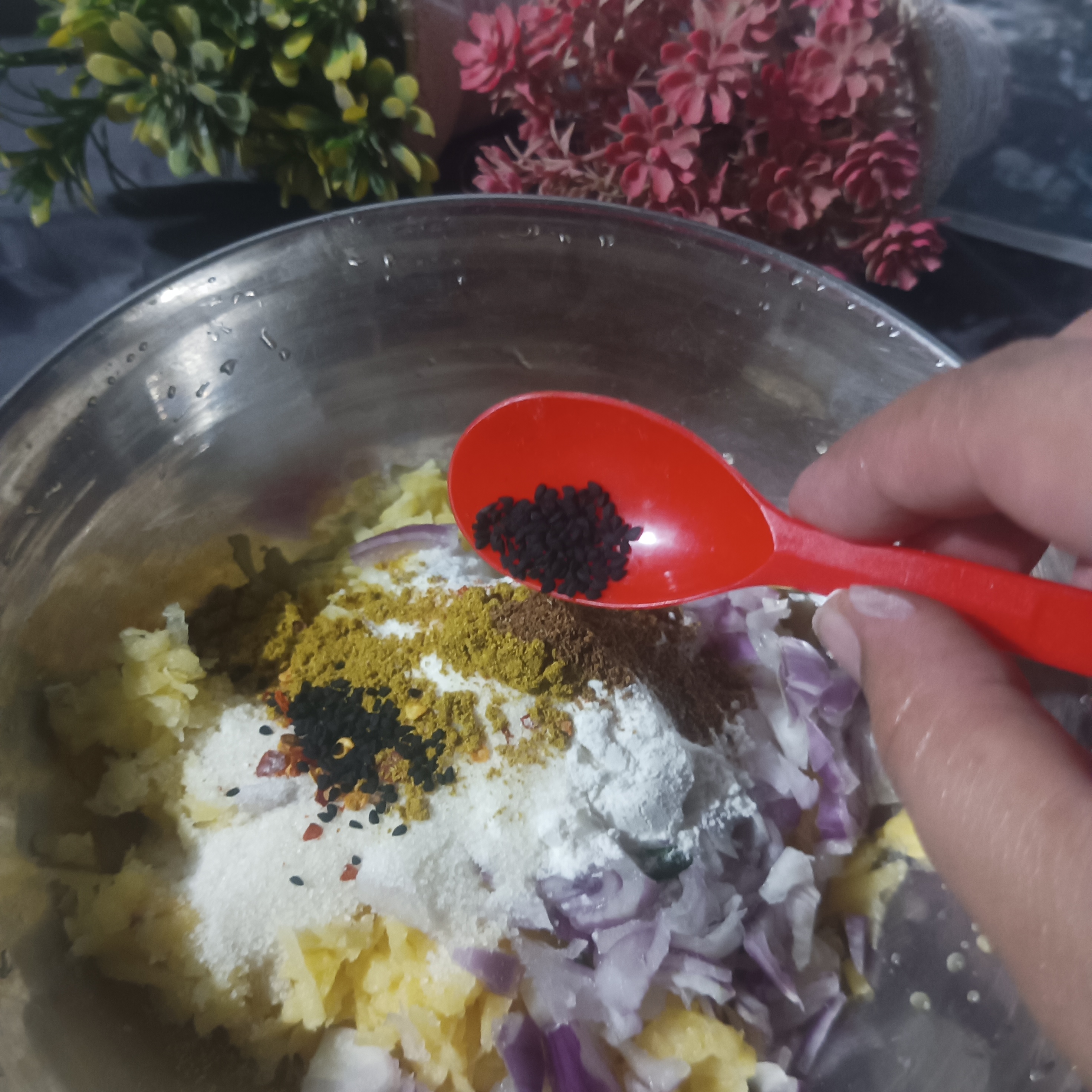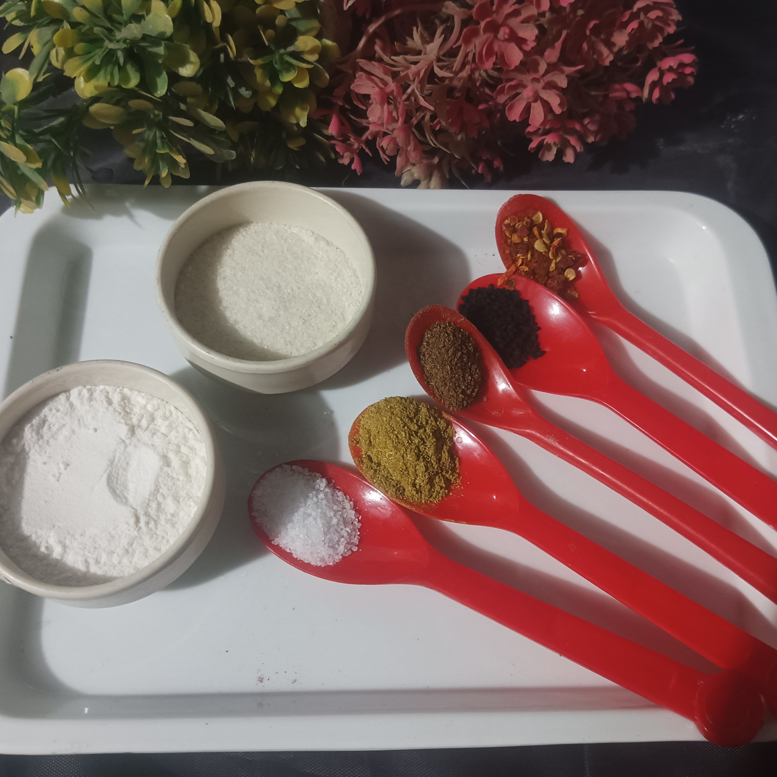 ½ cup Flour, ½ cup rice powder , ½tsp salt , ½ red chilli powder, ½ coriander powder, ½ Kalwanji , ½ cumin cardamom powder