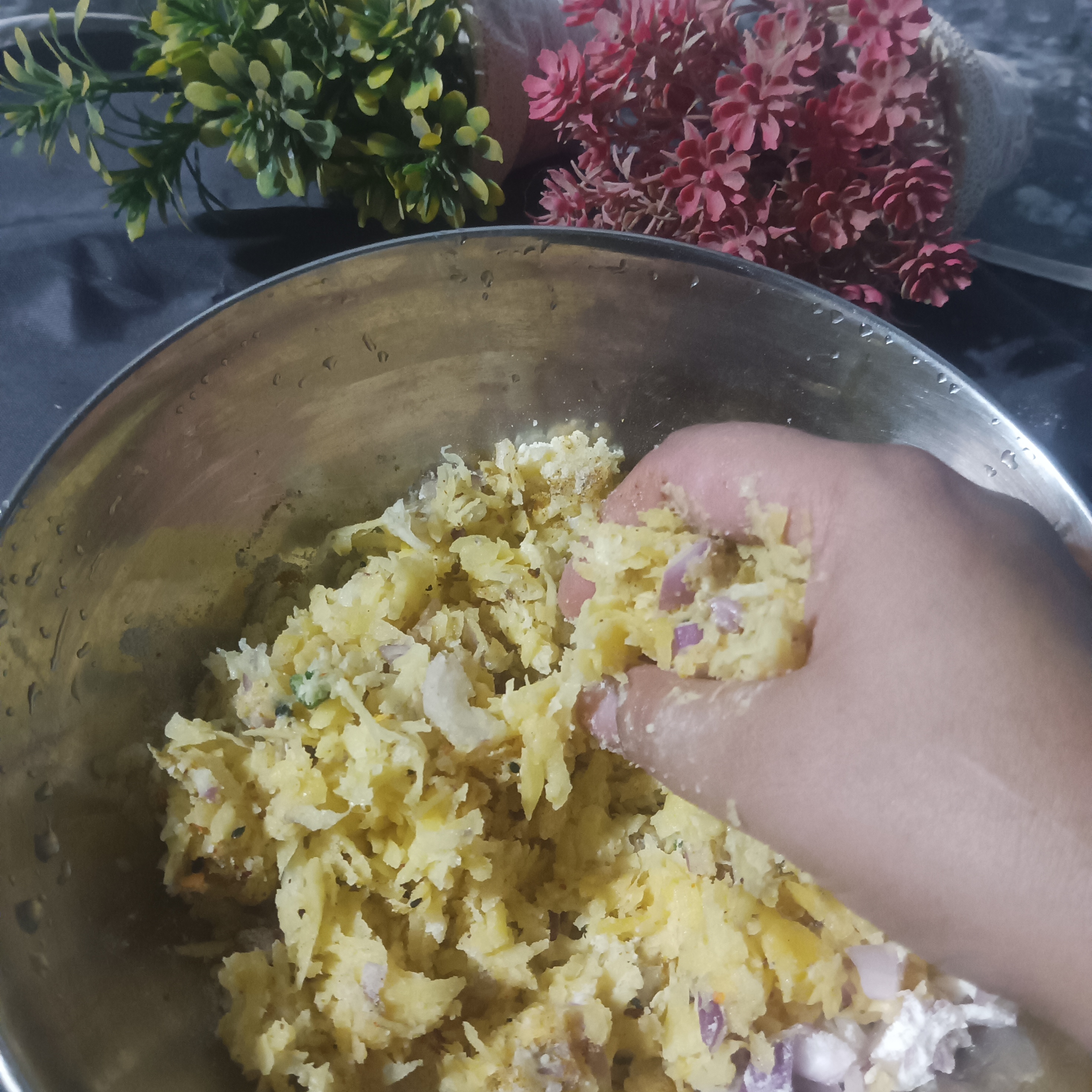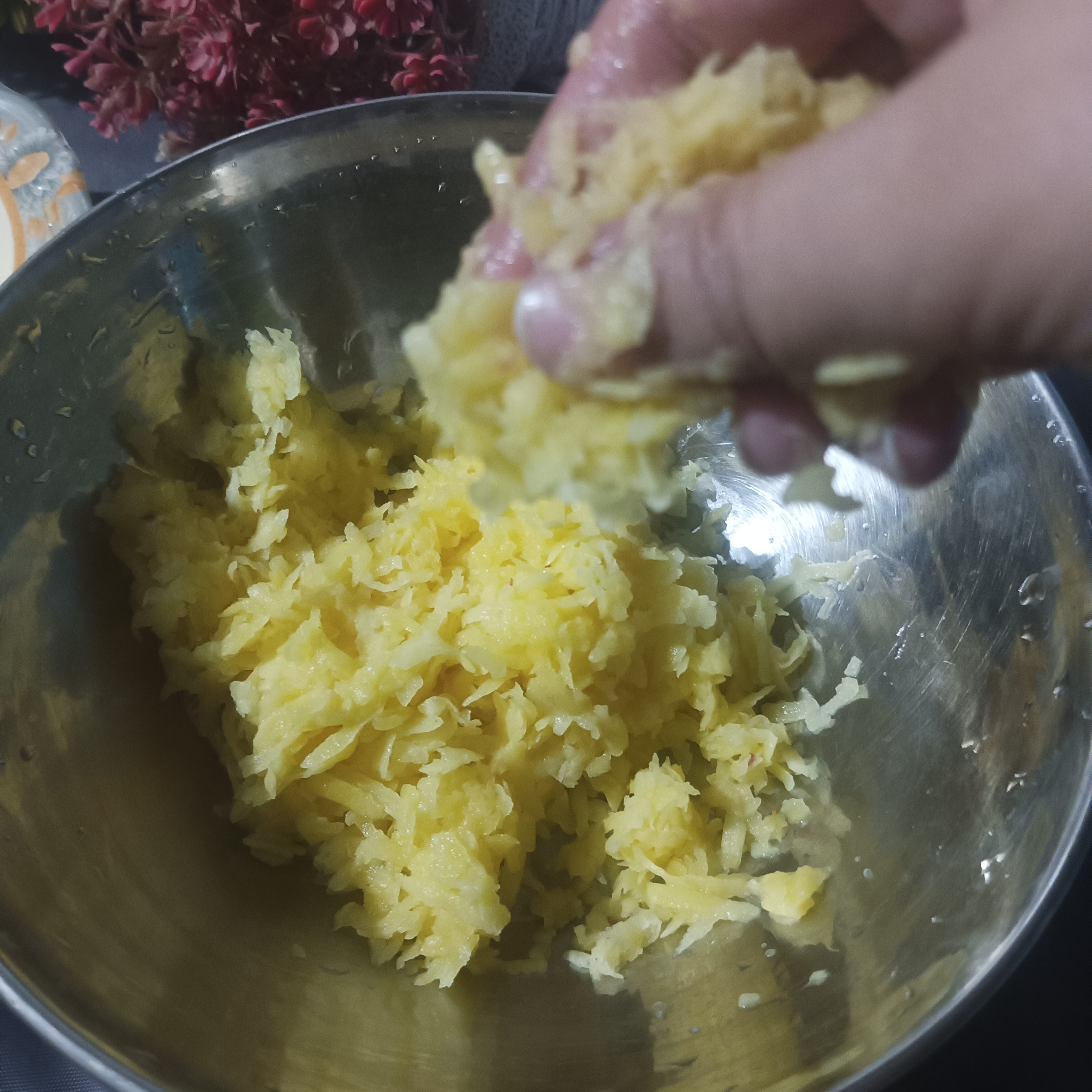 In the very next step, we will squeeze the potato's water from the grater potato's. Then dry potato's put into the an other pot. Here's with you can see that how much water is extracted from the grater and very smoothie and dry potato's are in the next bowl.