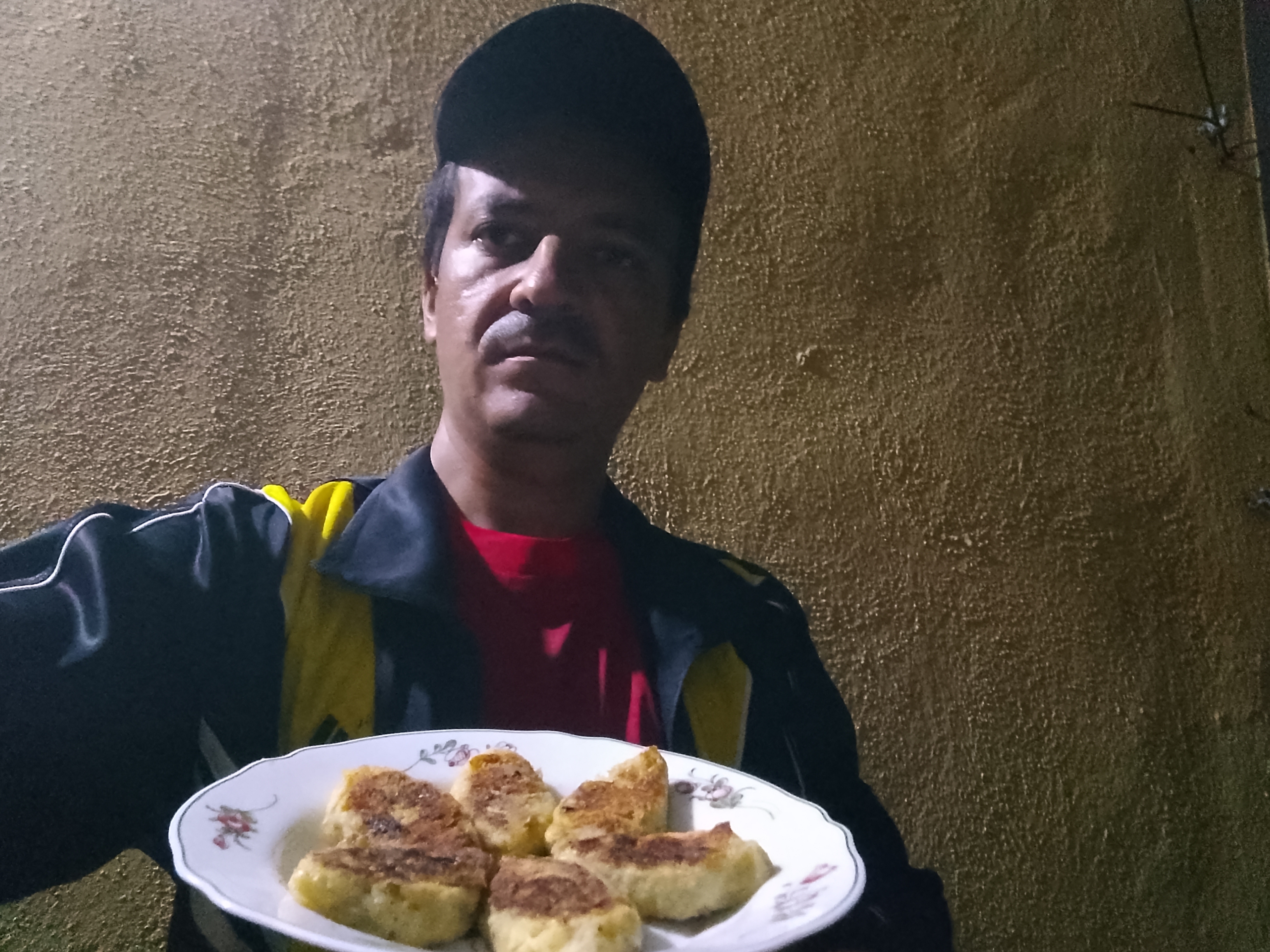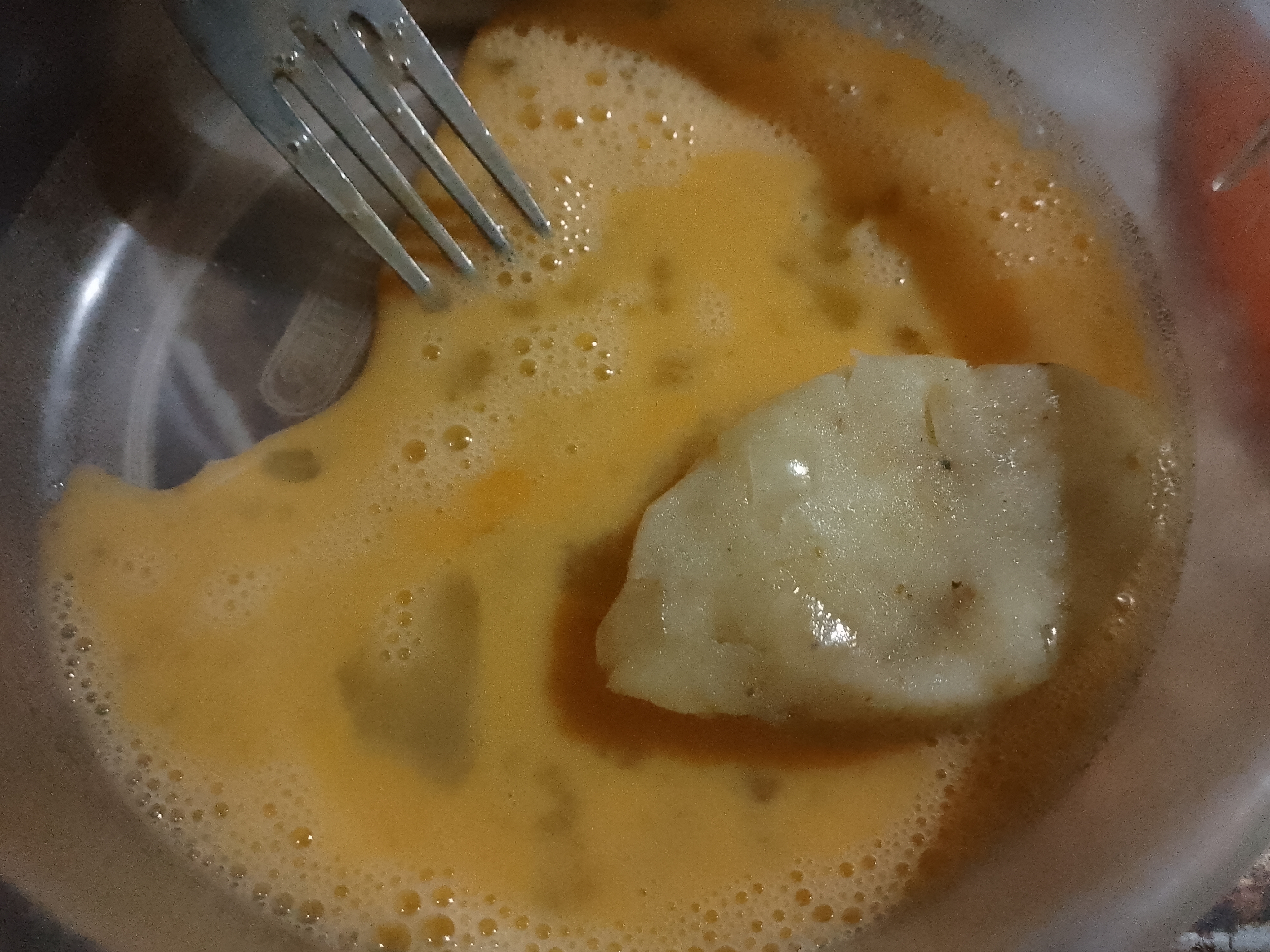Luego coloqué un huevo crudo en un recipiente, tomé un poco de masa en mis manos, con un poco de aceite, y le dí forma a las croquetas de patatas.