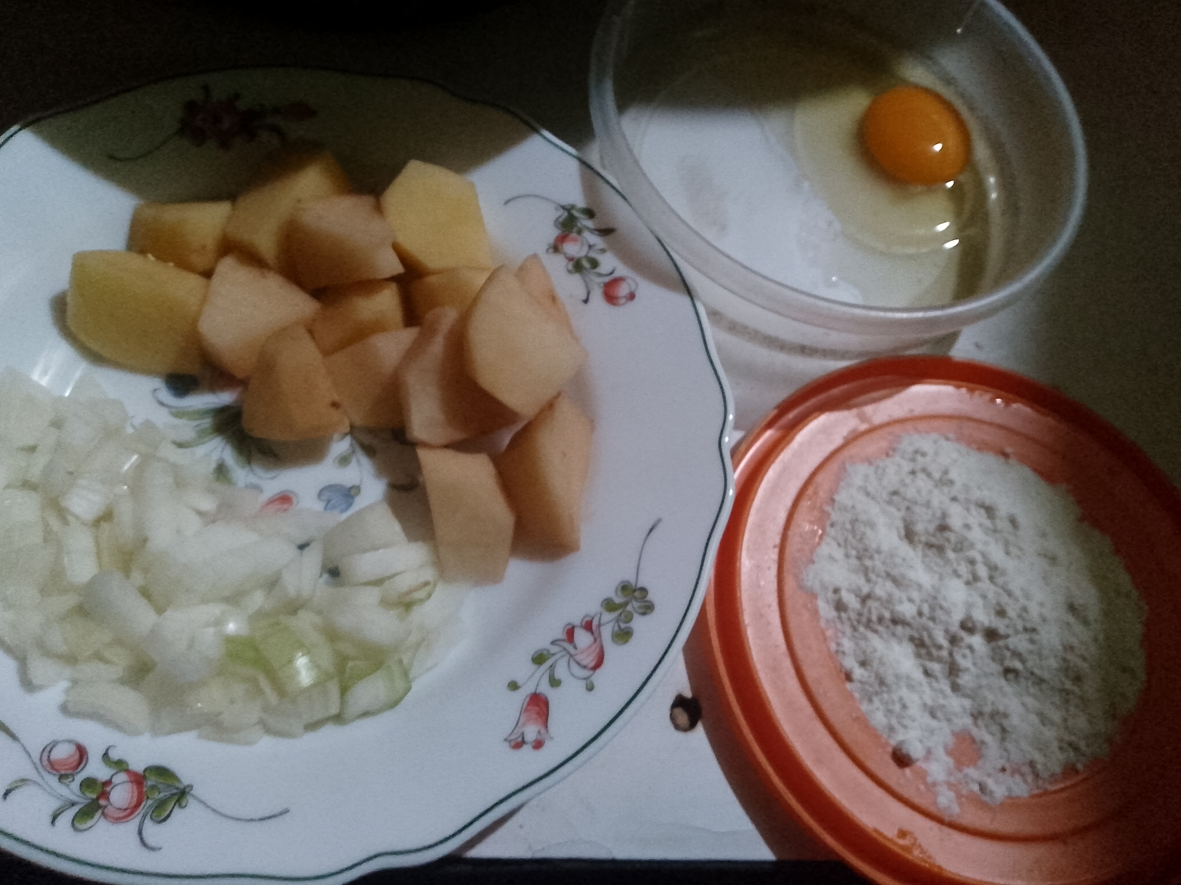 Entre los ingredientes se encuentran las papas, los huevos, las cebollas, la cúrcuma, el aceite, la sal, el chile y la harina (sustituto del polvo de galletas, ya que en mi país, o por lo menos en mí ciudad, no se consigue).