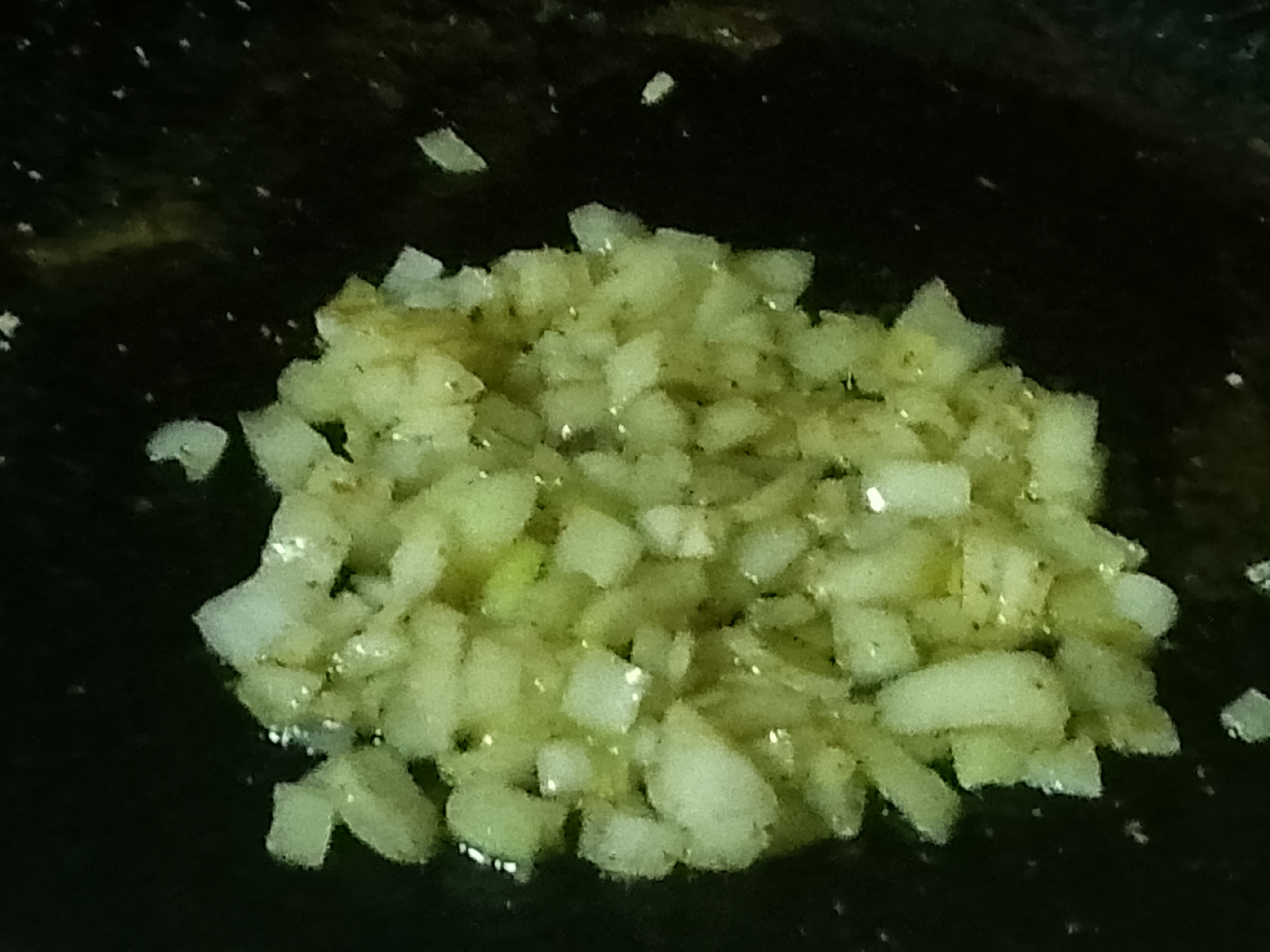 Simultáneamente en un sartén coloqué las cebollas en aceite para freírlas, también agregué especias y un poquito de chile, y una pizca de sal. Dejé cocinar y freír por un rato hasta que estuvo listo.