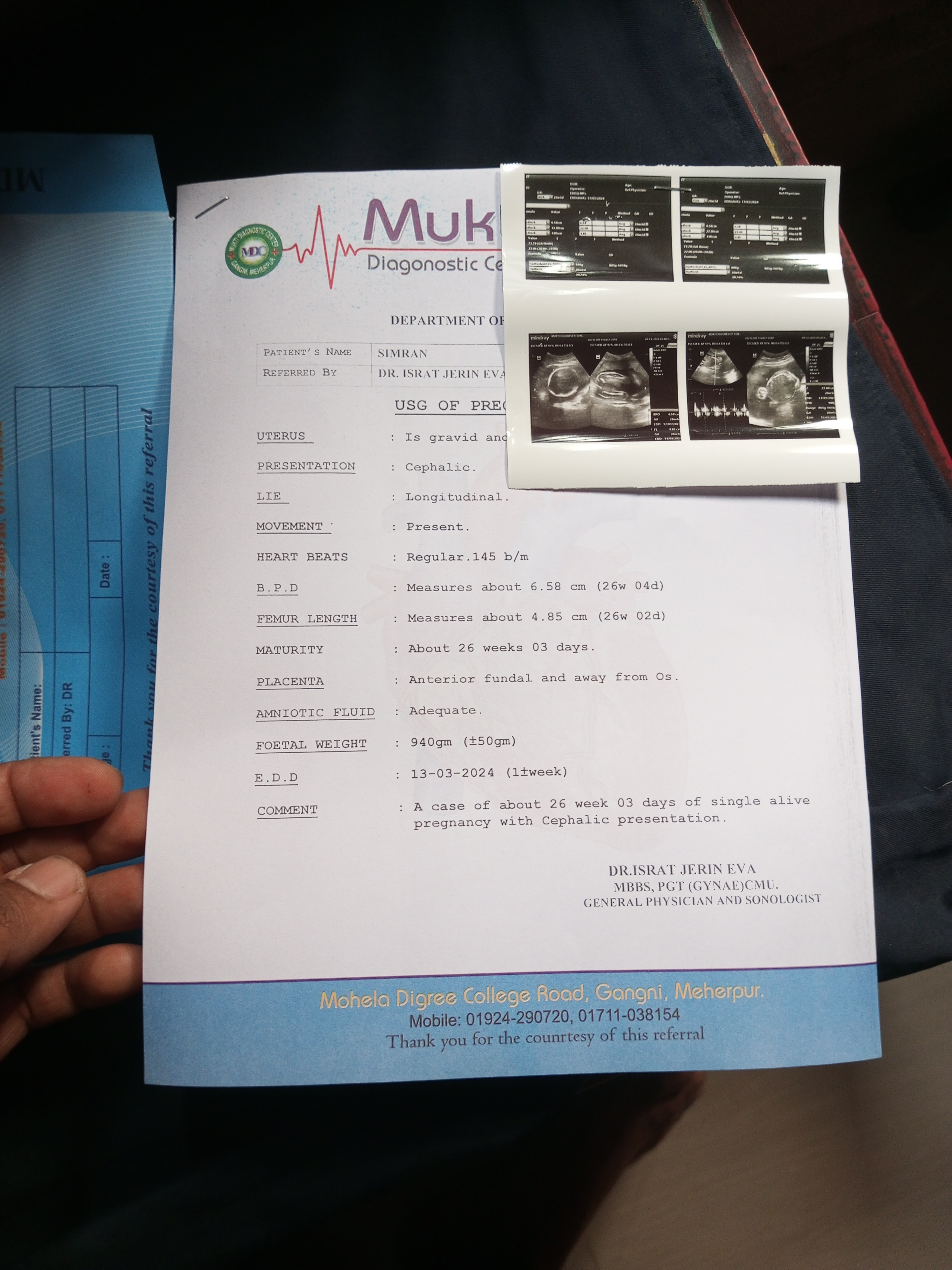কিছুটা সময়ের মধ্যে পর্যায়ক্রমে টেস্ট গুলো করা হয়ে গেল। আল্টাসোনো তে ম্যাডাম জানিয়ে দিল আমার গর্ভে মেয়ে সন্তান রয়েছে। কথাটা শোনার পর কিছুটা ভয় কিছুটা আনন্দ মনের মধ্যে কাজ করল। এরপর আমরা সমস্ত রিপোর্ট পাওয়ার আশায় বসে থাকলাম।