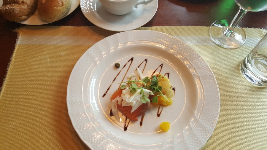 연어와 조개관자로 애피타이저가 나왔습니다. 맛도 좋지만 보기에도 좋은 플레이팅 입니다.