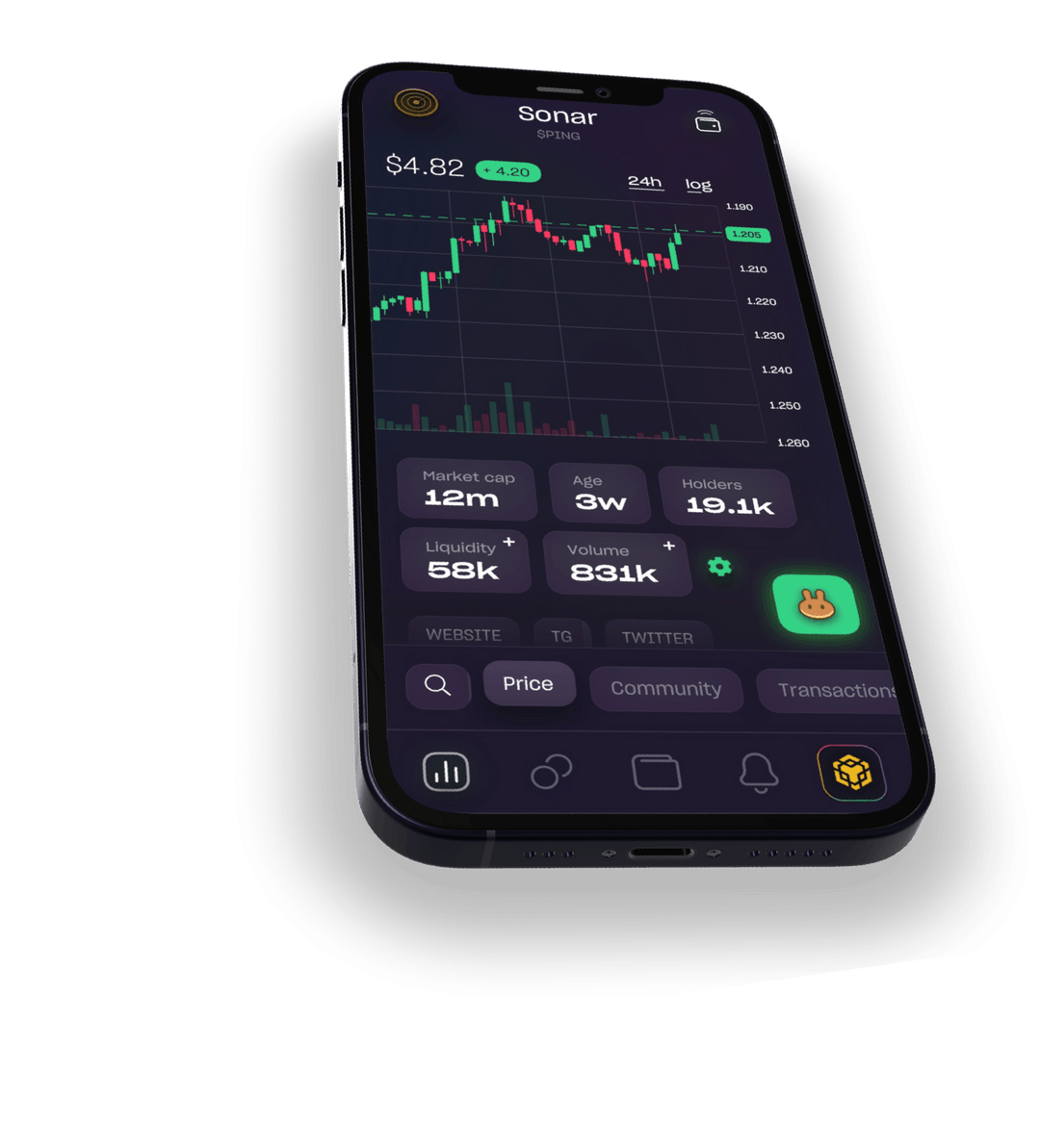 The Sonar Platform is an AI driven data aggregation suite which monitors the BSC and Ethereum networks (PancakeSwap, Uniswap) in real time. Meta-data is gathered and analyzed automatically and fed into our easy-to-use interface. Think of it as a one stop shop for all of this information and more. Any Crypto Coin or Token listed by Sonar will reflect a live feed of relevant information, available upon search or direct push notification saving you time and money.