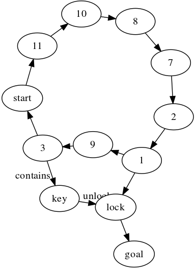 "X->Y; X->Lock->NewGoal; NewGoal[goal]; Y->Key[contains]; Key->Lock[unlocks]; Lock[lock]; Key[key];",