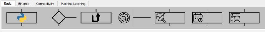 The programming area consist of 5 grids which can be populated with elements. The unit of 5 grids together is called a workflow. You can populate a grid with various elements by drag and drop them from the element bar to one of the placeholders (the ,,X”-elements at the end of the execution tree). You can choose elements from the fields Basic, Binance, Connectivity and Machine Learning.
