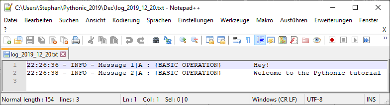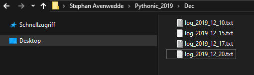 This scheme makes an easy recovery of log files possible, provides traceability and ensures that log files are not overwritten. When you start Pythonic, a new log file for the current day is created (if not already present). This happens also during the transition of two days.