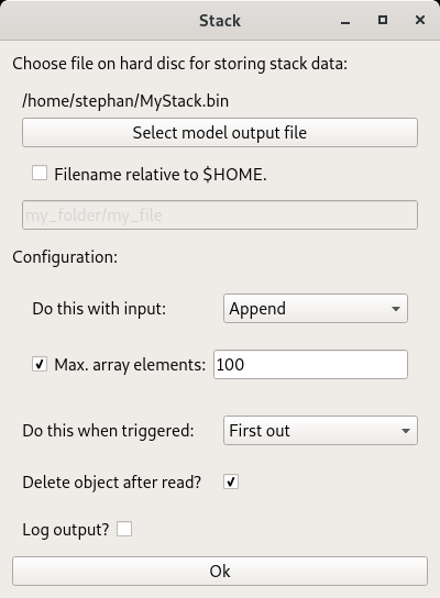 The Stack element enables you to save the output of a previous element persistent on the HDD. You have to select a file which the Stack element can operate on. You can device whether the input gets inserted, appended or if it's just use to trigger the stack for pulling data. You can also define a maximal stack size which causes an automatically deletion of stack elements if the element count exceeds.