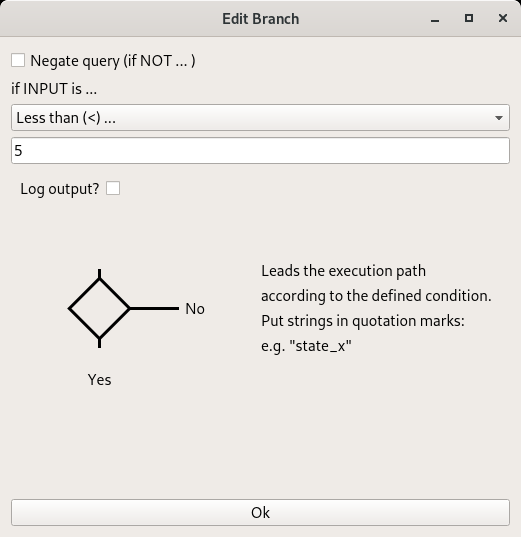 The Branch element allows you to split the execution path depending on the input. If it evaluates to True, the element below will be triggered. If it evaluates to False, the right side execution path will be triggered.
