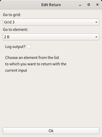 The Return element allows you to jump to an arbitrary element on one of the grids. The current input will be transferred. The Return element marks the end of the execution tree.