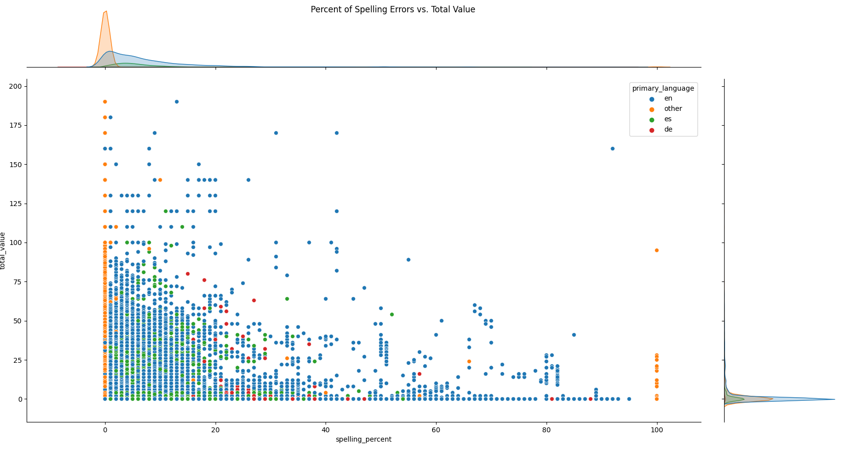 The biggest challenge I faced in downloading this data was tracking the spelling errors. Originally, I was detecting the language of each word, and listing the language as one of the post's languages if that language had a certain number of words in the post. I then spell checked every word in the body in each of the dictionaries for the languages the post was in, and listed it as an error if it wasn't in any of the dictionaries. The problem came that most of the articles with bigger word counts and multiple languages were taking a minute or more to process. Almost all of the articles were taking a couple of seconds.