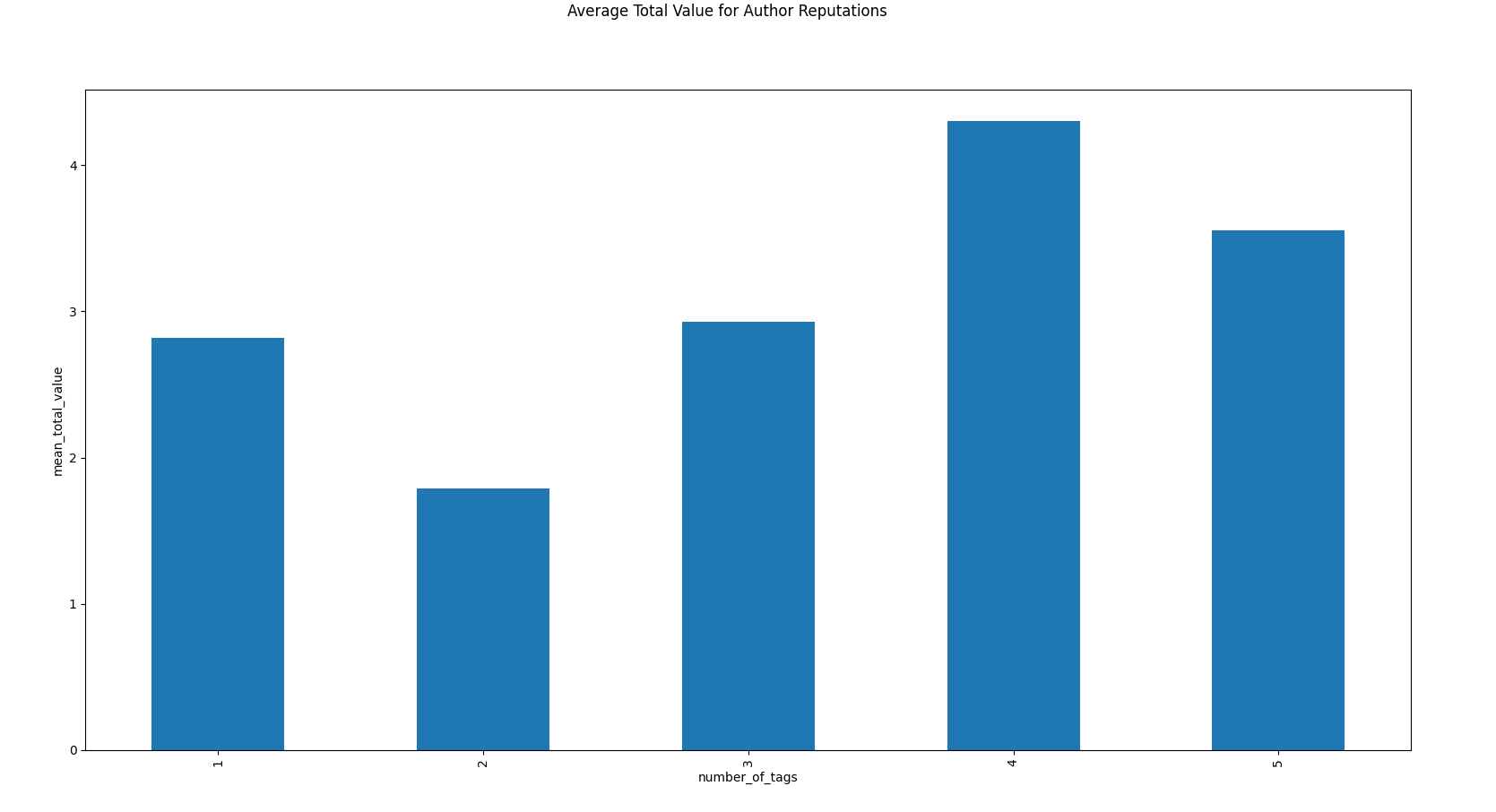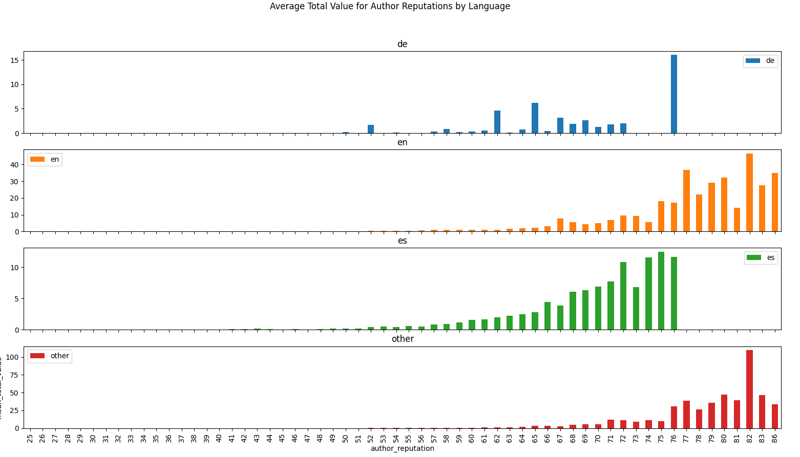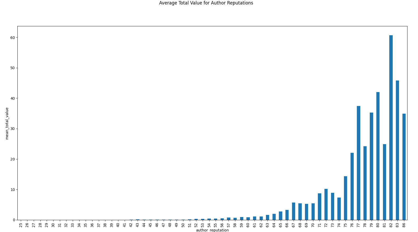 Next, I'm thinking the "cause and effect" for total value vs. author reputation is backwards from the way we might think of it at first glance. High reputation doesn't necessarily produce high rewards, but rather, authors who consistently get high rewards build higher reputations.