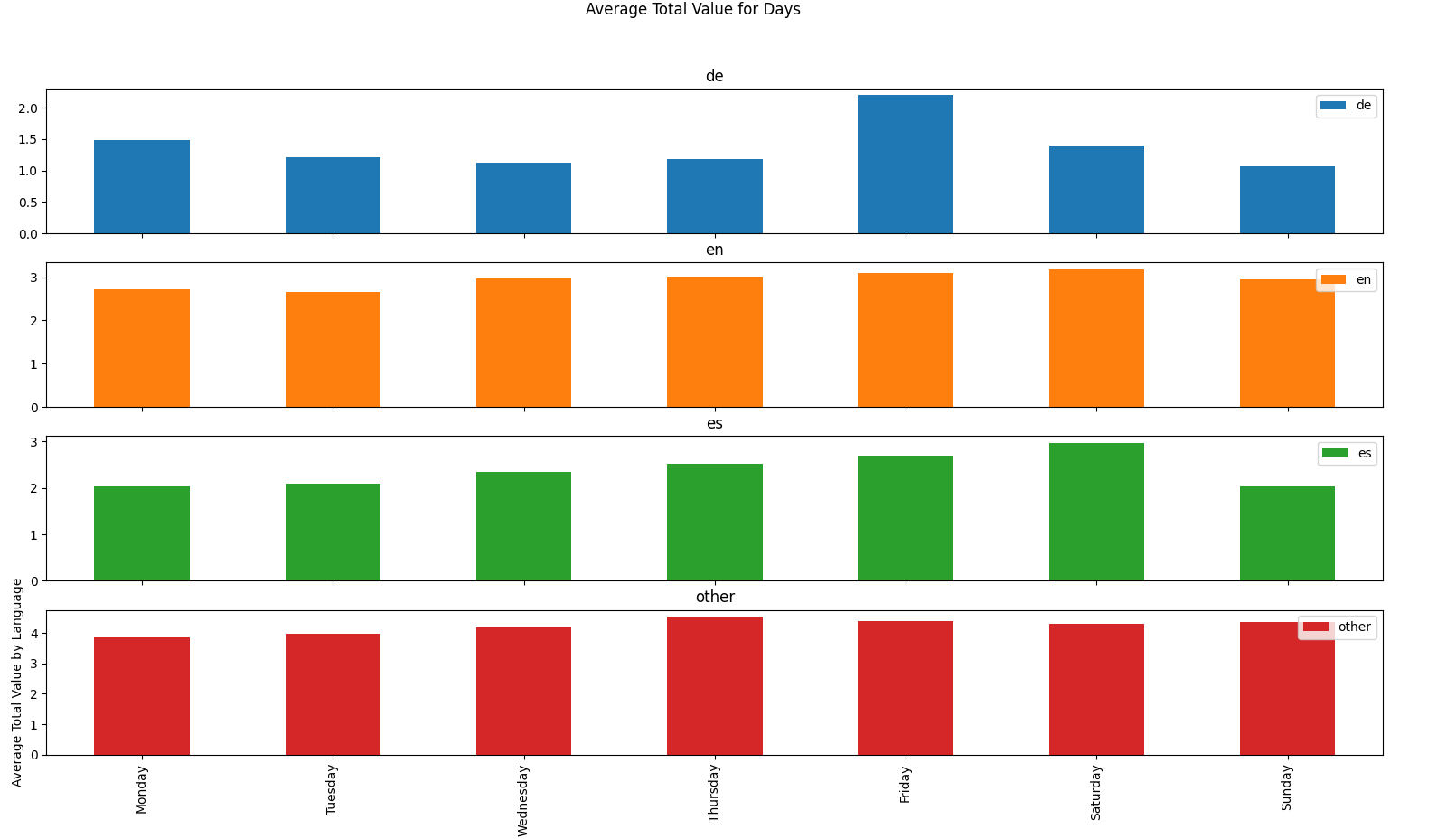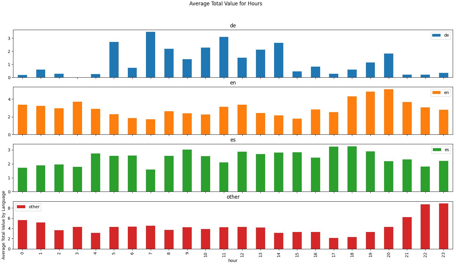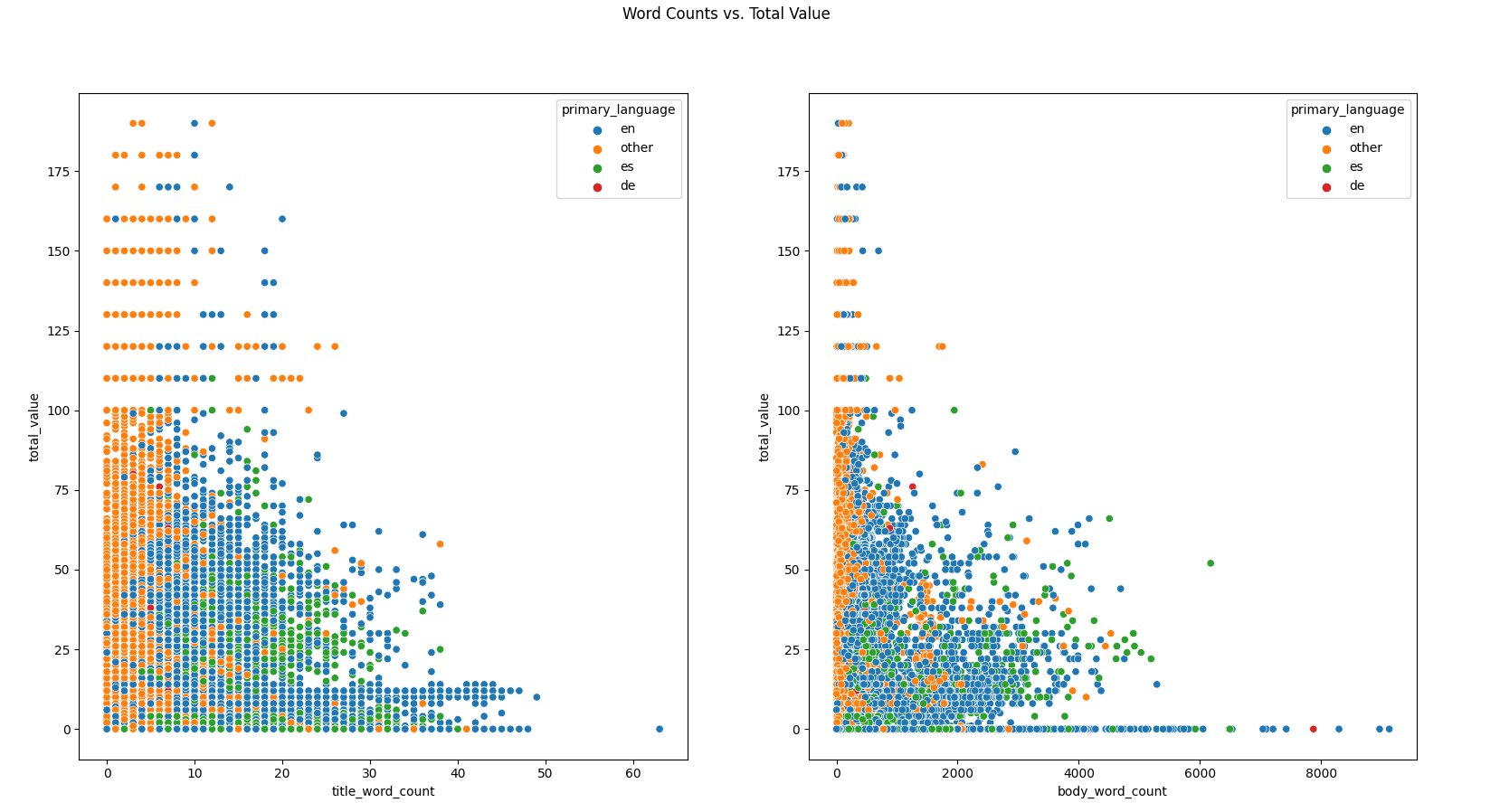 Also, the word count graphs are interesting. I wasn't expecting to see so much English. And the language groupings for word counts in the title and bodies are interesting. Maybe part of that is because Asian languages use symbols instead of letters and words. In English, German, and Spanish, it seems like there's a strong preference for titles under 20 or so words and bodies under 1,000 or 1,500 (the image resolution won't let me distinguish in more detail).