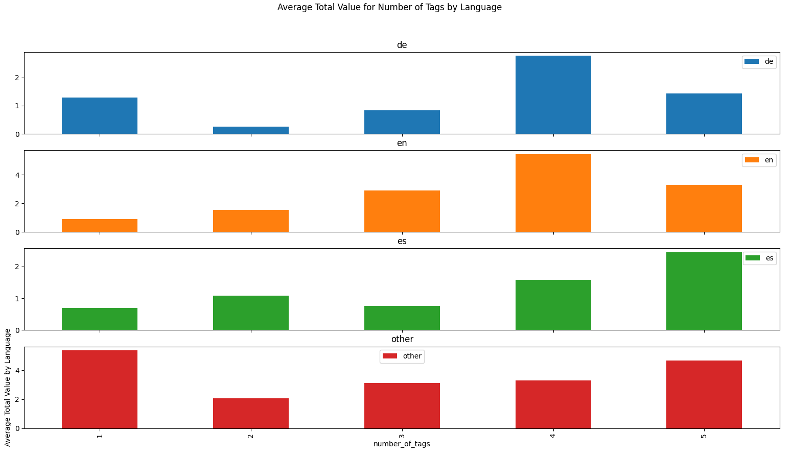 Obviously, you can't read too much into a single average, but I'm a little surprised that 4 tags averaged more than 5 tags in English, German, and overall.