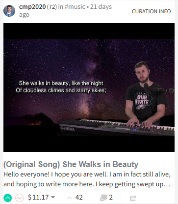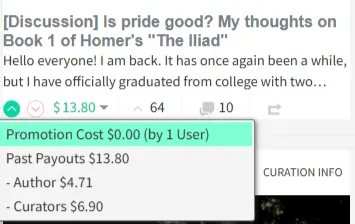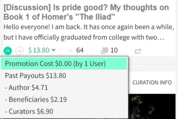As you can see, the post is only displaying a payout of $11.61, but it actually paid out $13.80. Curators checking this author’s page will have a false perception of how much the author is making if the author designates beneficiaries on their posts. Eventually, we will change this number, but first, I’d like to get the author and beneficiary values.