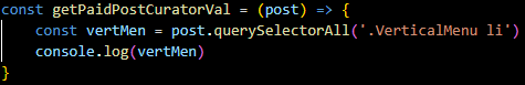 Within a post’s list Item, I notice that the payout information is contained in a container with the HTML class VerticalMenu . Within this menu, there are typically 4 list items, and the last list item contains the curator payout data in its innerText field.