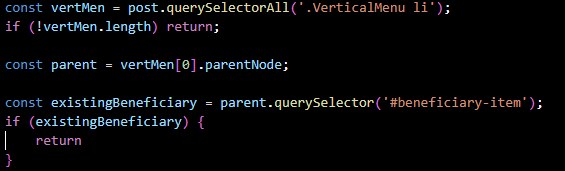 If we aren’t careful, the mutation observer will insert a duplicate beneficiary value for every post every time a mutation is observed. We only want it to do this once so we will use an id and check if it exists before inserting: