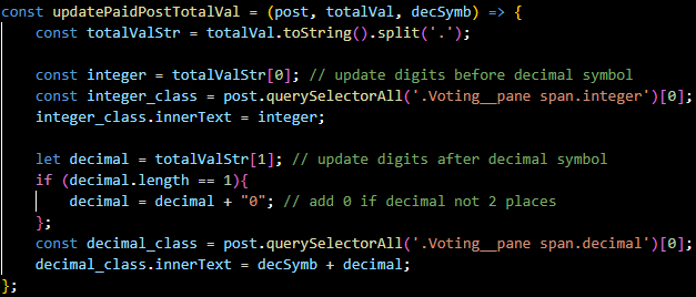 First, we will update the value displayed as the post’s total payout value. We can do this using the Voting__pane class which has spans containing either the integer class or the decimal class indicating the section of the number. We will make a function to set these values equal to the integer section of our calculated total value and the decimal portion of our calculated total value: